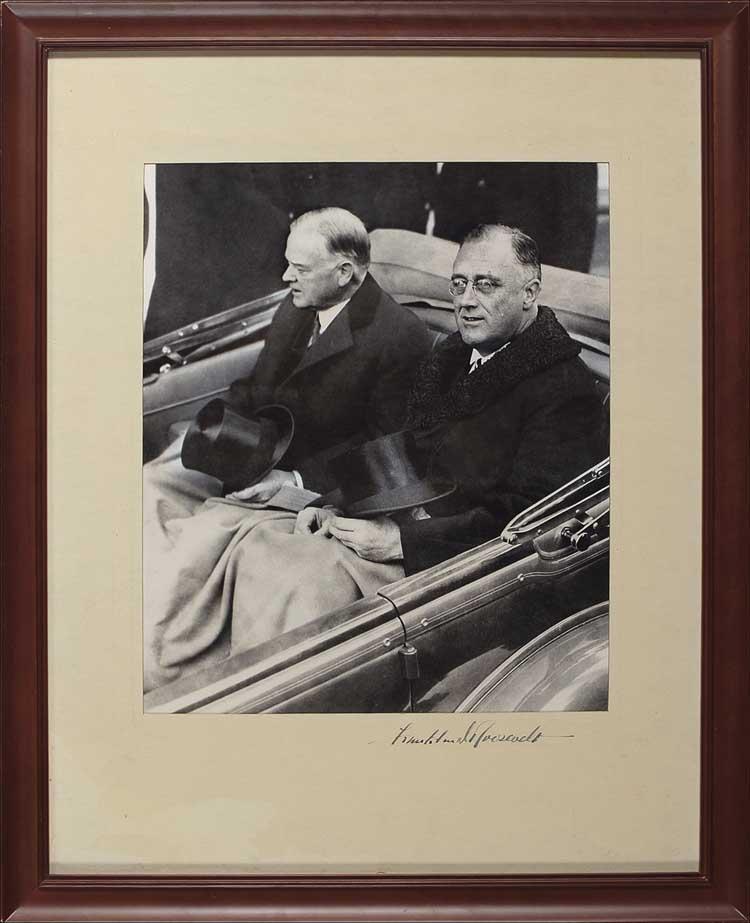 Wonderful vintage matte-finish 11 x 13 photo of Roosevelt and Herbert Hoover riding in the back of a convertible, undoubtedly on the presidential inauguration day, matted to an overall size of 15.5 x 19.5 and beautifully signed on the mat in fountain pen by Roosevelt. Framed to an overall size of 18 x 22. In fine condition, with some scattered light toning to mat.