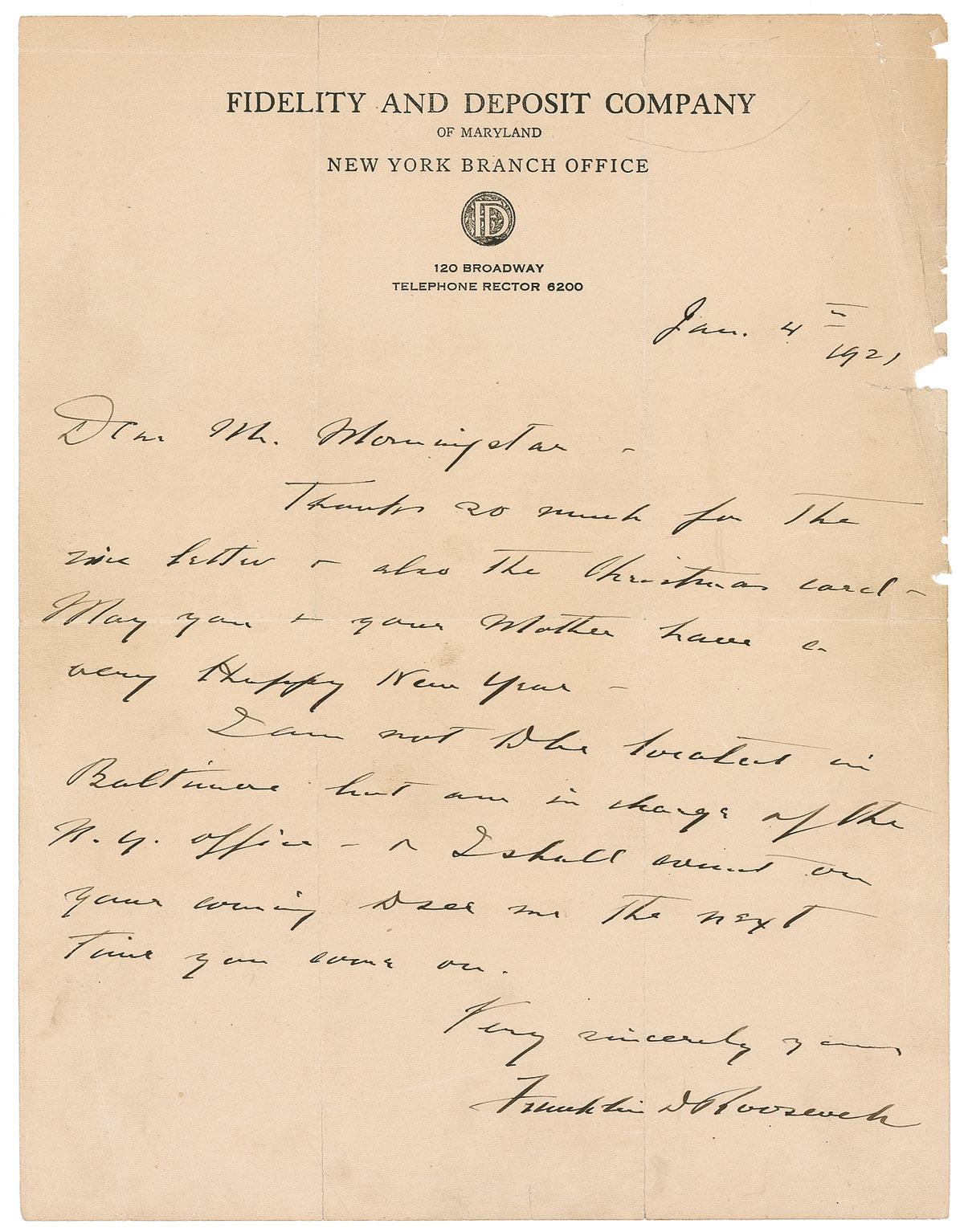 ALS, one page, 8.5 x 11, Fidelity and Deposit Company letterhead, January 4, 1921. Letter to Mr. Morningstar. In part: “Thanks so much for the nice letter & also the Christmas card—May you & your mother have a very Happy New Year.” Intersecting folds, one through a single letter of signature, several small fold separations, uniform toning, a few creases, and paper loss to right edge, otherwise very good condition. Pre-certified John Reznikoff/PSA/DNA and RRAuction COA.