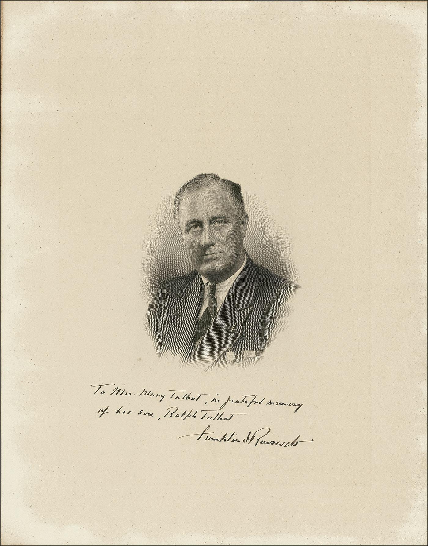 Vintage matte-finish 11 x 14 steel engraving, signed and inscribed in black fountain pen, “To Mrs. Mary Talbot, in grateful memory of her son, Ralph Talbot. Franklin D. Roosevelt.” In fine condition, with a few light creases, mild, mostly uniform toning, lightly chipped corners and a paperclip impression at the top border. A desirable item sent to mother of the young lieutenant who, during World War I, became the first Marine Corps aviator to be awarded the Medal of Honor. It’s possible it was given to Talbot during the construction or commissioning of the USS Ralph Talbot, a US Navy destroyer.