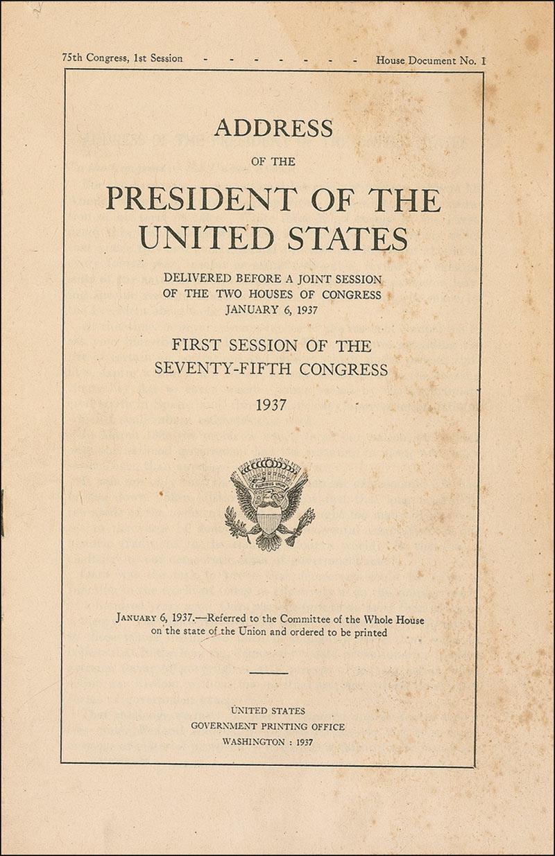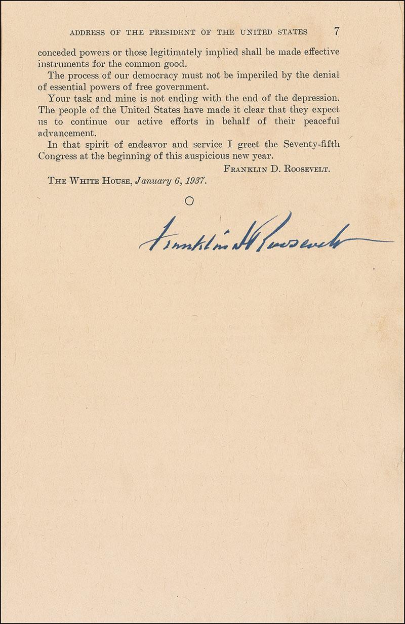 Printed speech, officially titled “Address of the President of the United States Delivered Before a Joint Session of the Two Houses of Congress January 6, 1937,” Roosevelt’s 1937 State of the Union, 6 x 9, seven pages, signed at the conclusion in blue ink by Roosevelt. Central horizontal fold, scattered creasing and handling wear, with some creases lightly affecting signature, and foxing and soiling to front cover, otherwise very good condition.