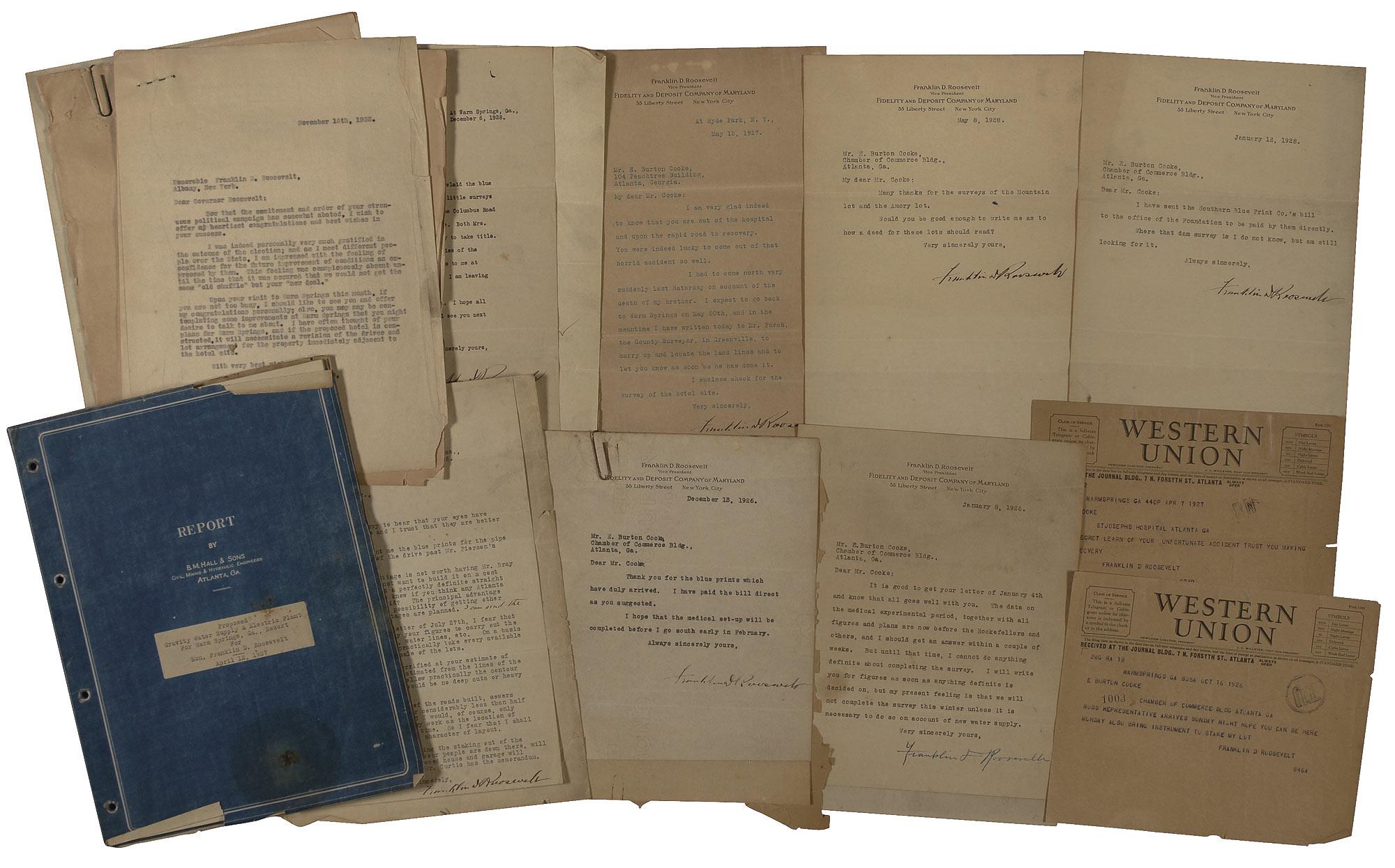 An interesting archive concerning the construction of Roosevelt’s Warm Springs Resort, primarily the water supply system as well as the electric plant. Archive consists of six one-page TLSs from Roosevelt dated between 1926-1928, a secretarially signed TLS dated January 8, 1926, all to E. Burton Cooke of Atlanta, a landscape architect; related correspondence to Roosevelt from Cooke, as well as other letters and telegrams between other involved parties; and the 1927 engineers report for the water supply and electrical plant for the Warm Springs Resort. Archive includes: