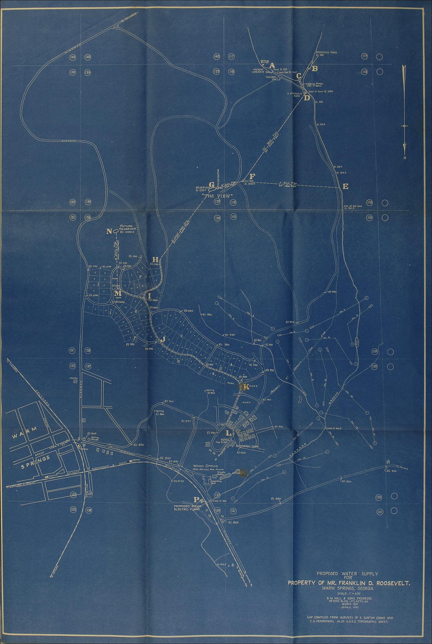 The engineering report submitted by B. M. Hall and Sons is titled “Proposed Gravity Water Supply & Electric Plant for Warm Springs, Ga. Resort for Hon. Franklin D. Roosevelt,” dated April 12, 1927. Report is broken in two two sections, a 14 page proposal on the gravity water supply, and a five page report on the proposed electric plant. Bound in to the final page of the report is a blueprint for the proposed water supply system at the resort, which unfolds to a size of 22 x 33, and shows the current hotel and cottages, the new subdivision, the golf course, all the major roads and streams, a future reservoir, and the main features of the proposed water supply system. In good to very good condition, with toning and soiling to all correspondence, some fold separations to several letters, toning and wear to report, storage folds to blueprint, as well as some scattered light spotting.