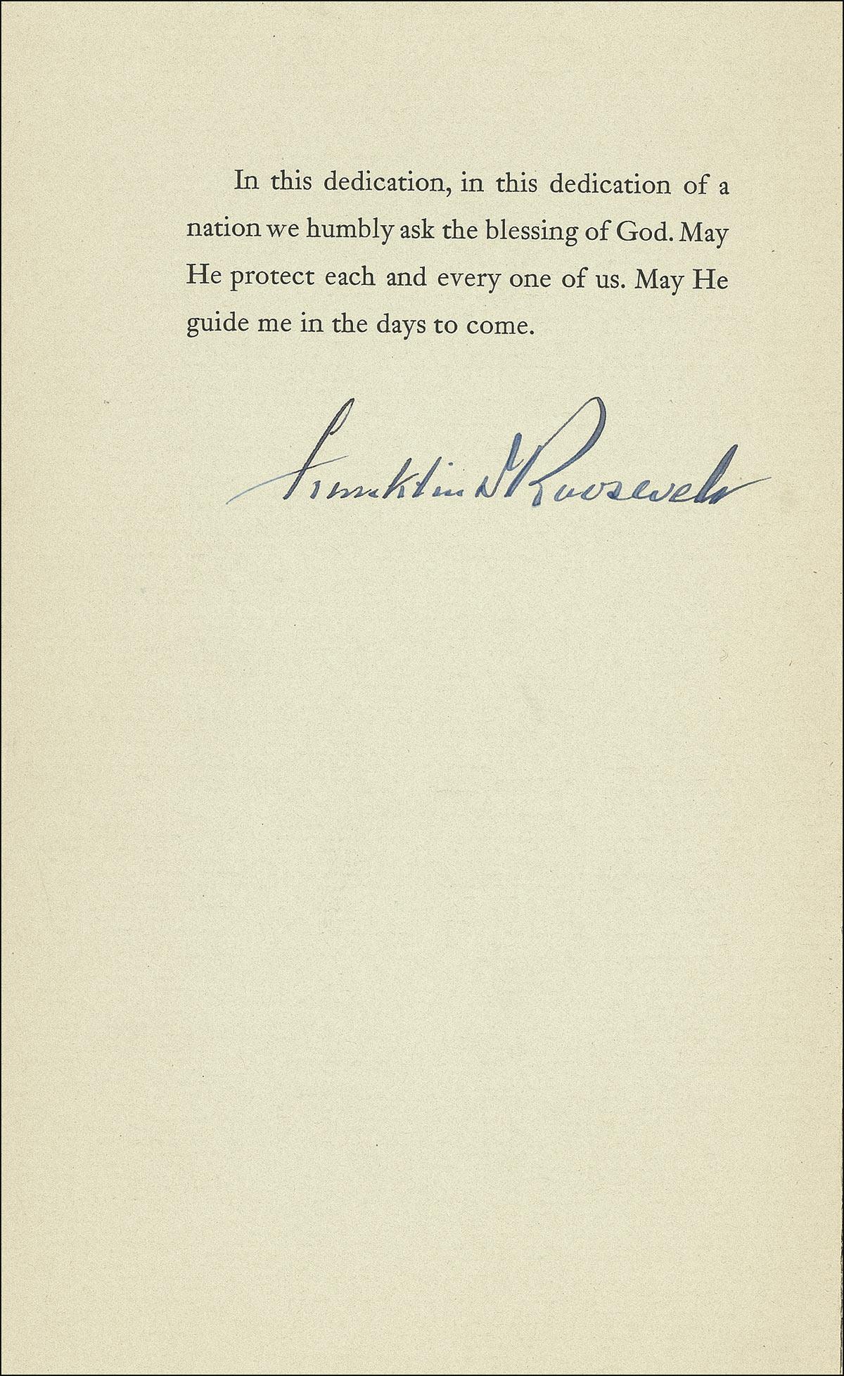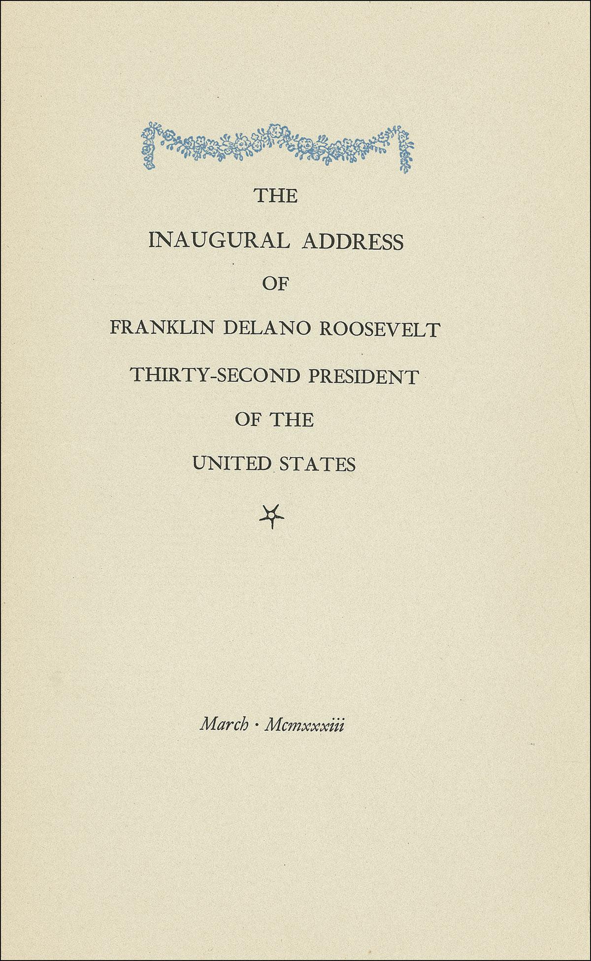 Rare signed book: The Inaugural Address of Franklin Delano Roosevelt, Thirty Second President of the United States. NY: Harbor Press, 1933. Hardcover with slipcase, 5.5 x 9. Signed at the conclusion of the address in blue ink, “Franklin D. Roosevelt.” In very good condition, with moderate toning and staining to pastedowns and front and back free end pages, blocks of toning to half-title page, and all pages fully detached from the covers and partially detached from the binding. The inside pages, including the signed page, are clean and unaffected by any of the flaws.