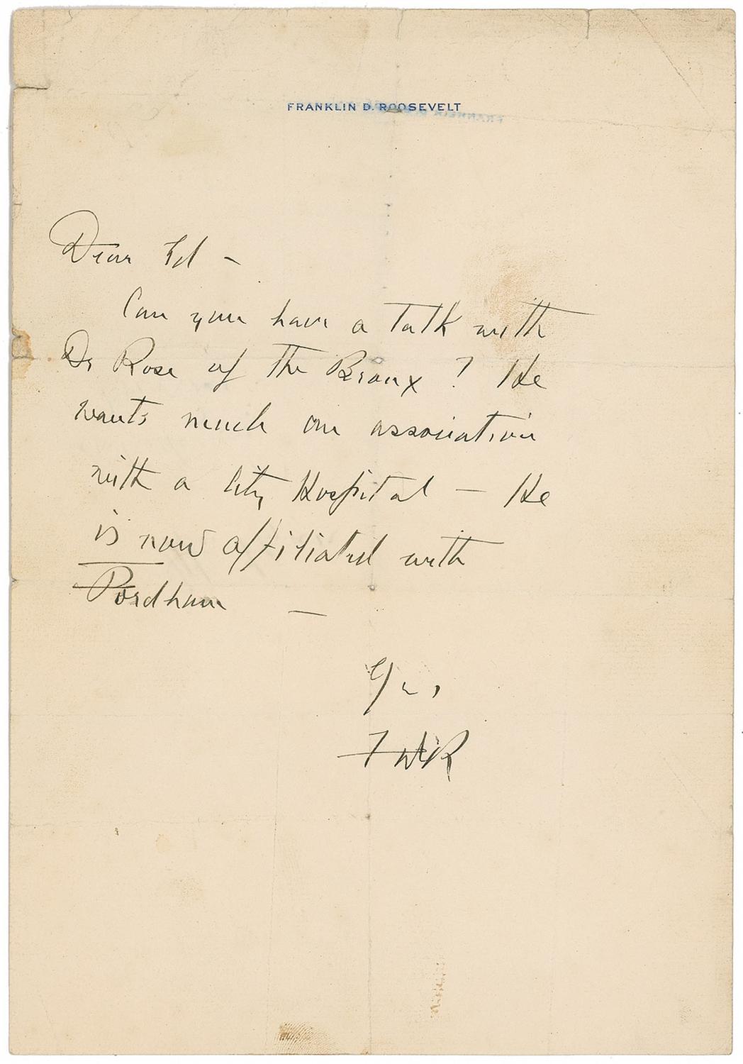 Short ALS signed “FDR,” one page, 7.25 x 10.5, personal letterhead, no date. Short letter to an associate. In full: “Can you have a talk with Dr. Rose of the Bronx? He wants much an association with a City Hospital—He is now affiliated with Fordham.” Reverse bears a small address panel in another hand Intersecting folds, one through a single letter of signature, scattered toning and soiling, and a few small separations along folds, otherwise very good condition.