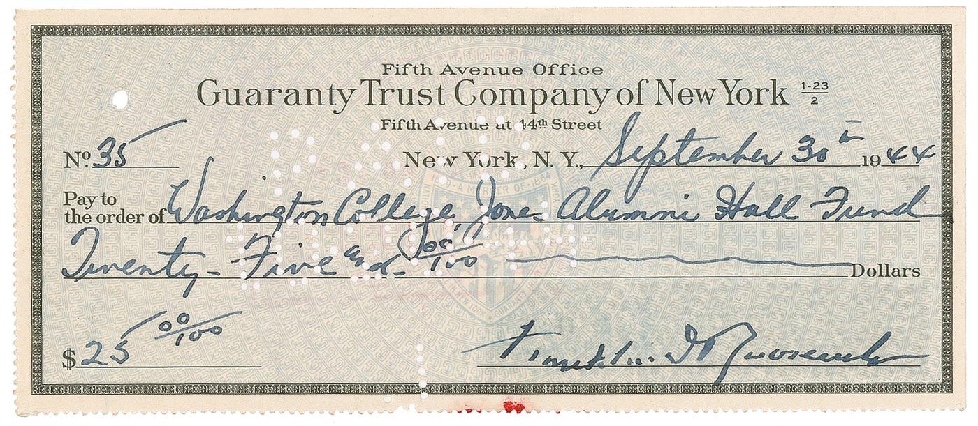 Bank check, 6.5 x 2.75, filled out in another hand and signed by Roosevelt, payable to Washington College Jones Alumni Hall Fund for $25.00, September 30, 1944. In fine condition, with expected holes, some light show-through from stamps on reverse, and a punch hole to top left.