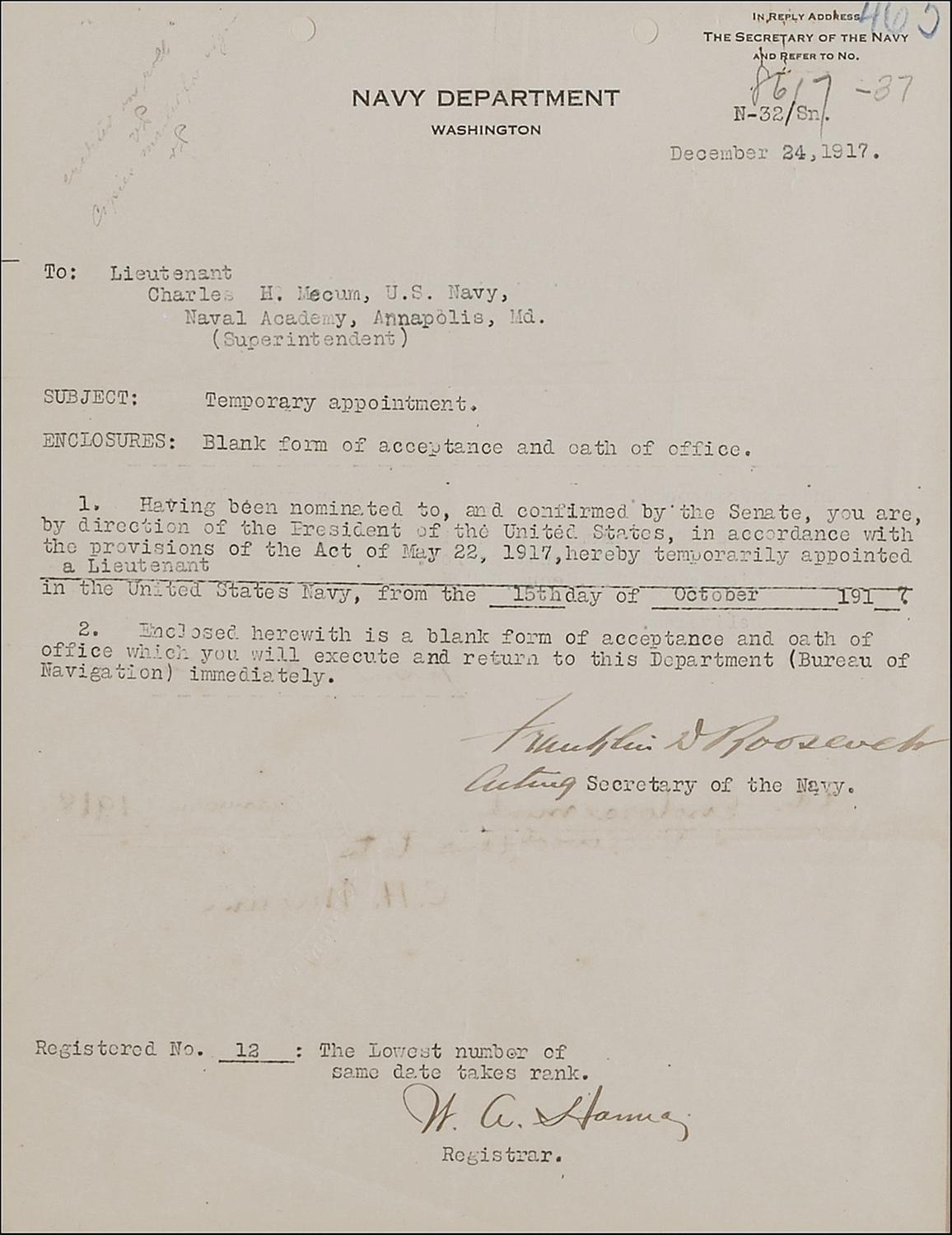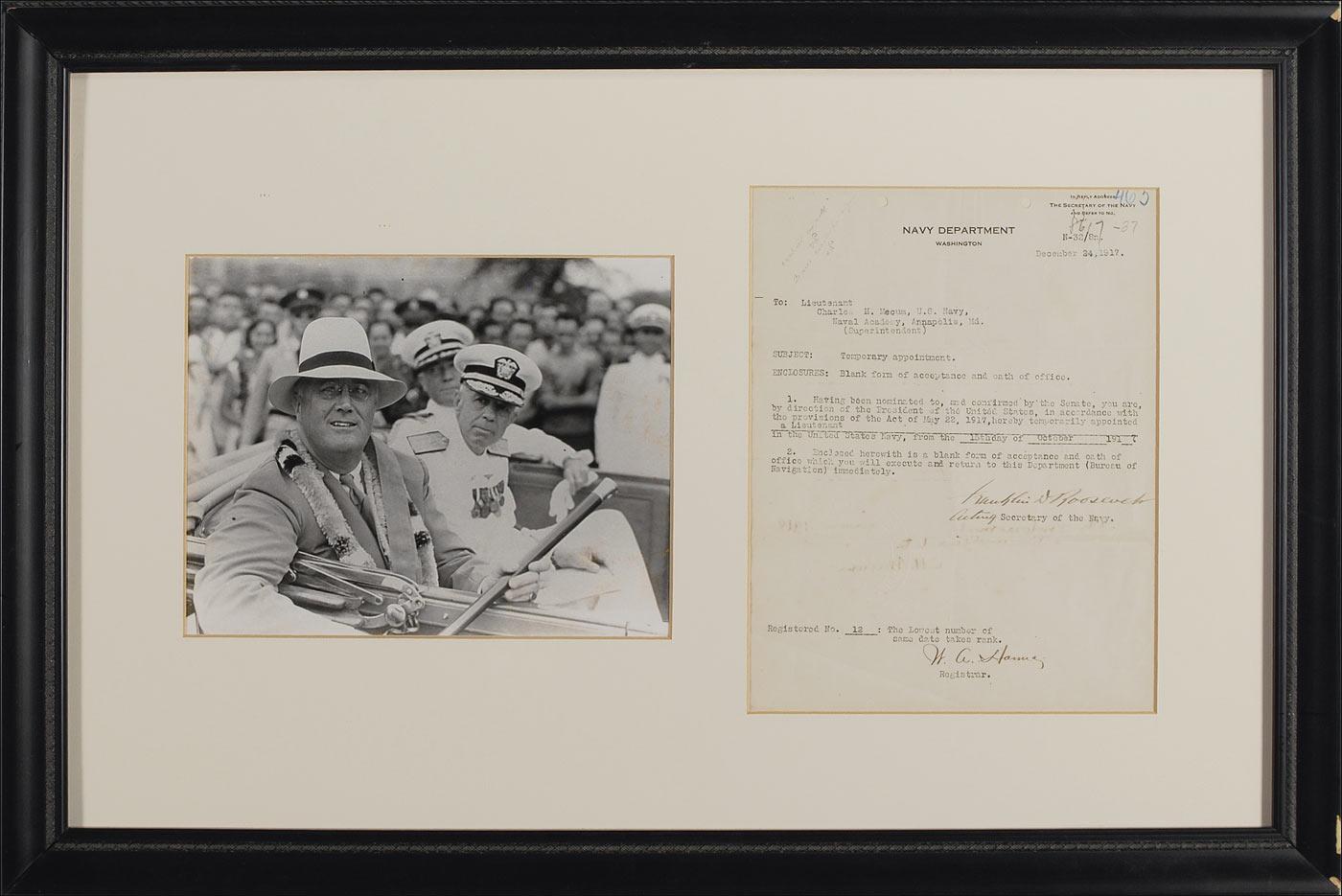 TLS, one page, 8 x 10.5, Navy Department letterhead, December 24, 1917. Roosevelt, as acting Secretary of the Navy, gives a temporary appointment of the rank of Lieutenant to Charles H. Mecum, Superintendant of the Naval Academy. Matted and framed with a portrait of Roosevelt riding in a car, to an overall size of 25.75 x 18.5. In very good condition, with several pencil notations, scattered light soiling, punch holes to top edge, show-through from endorsement on reverse, and heavy horizontal folds. Oversized.