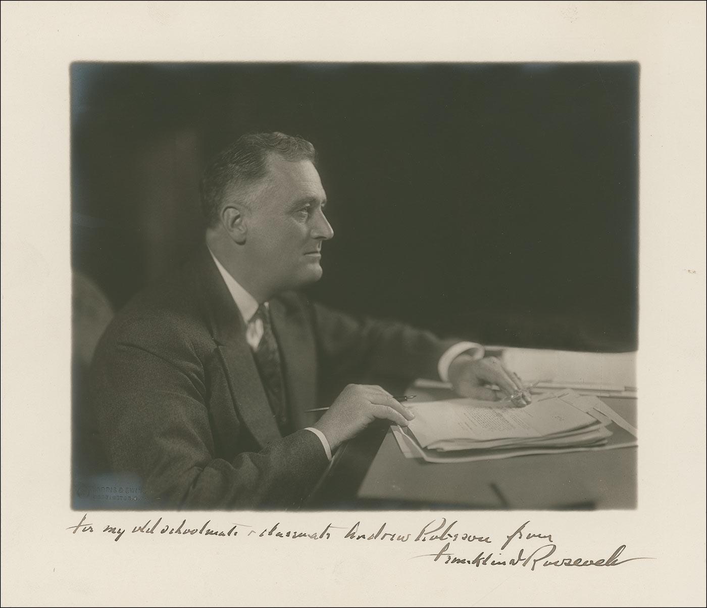 Vintage matte-finish 11.5 x 10 Harris and Ewing lightweight photo of Roosevelt pouring over papers on his desk, signed and inscribed in the lower border in fountain pen “For my old schoolmate & classmate Andrew Robinson from Franklin D. Roosevelt.” In fine condition, with a mild vertical bend, light silvering to two corners of image, and a bit of light edge soiling. Roosevelt’s signature and inscription are quite bold and prominent.