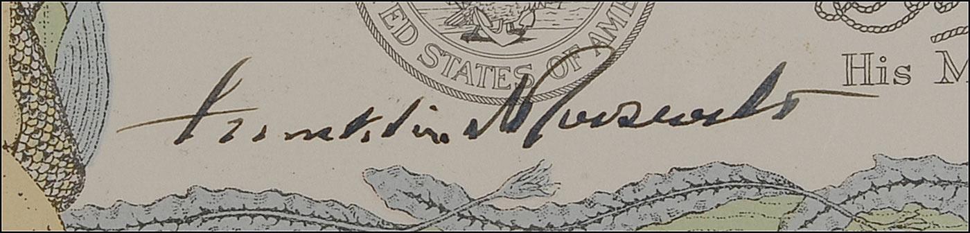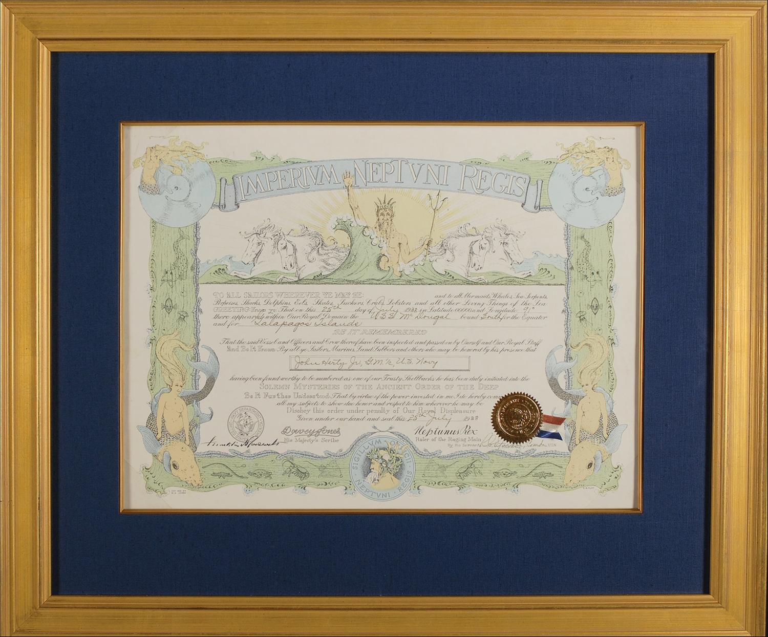 Pristine partly-printed DS, one page, 19.5 x 14.5, July 25, 1938. An attractive Shellback certificate issued to John Herty, Jr., G.M. 1/c, US Navy, and reads, in part: “To all sailors wherever ye may be, and to all Mermaids, Whales, Sea Serpents, Porpoises, Sharks, Dolphins, Eels, Skates, Suckers, Crabs, Lobsters and all other Living Things of the Sea, Greetings. Know ye that on this 25th day of July, 1938 in Latitude 0000 and Longitude 91° there appeared within Our Royal Domain the U. S. S. McDougal bound South for the Equator and for Galapagos Islands …Be it remembered…John Herty…having been found worthy to be numbered as one of our Trusty Shellbacks has been duly initiated into the Solemn Mysteries of the Ancient Order of Deep.” Signed by “Davey Jones” and “Neptunus Rex” in type and boldly signed in fountain pen by Roosevelt under the printed Naval seal. Nicely, archivally cloth matted and framed using mylar corners only, no tapes or adhesives, to an overall size of 29 x 25. In fine, clean condition. The gold foil seal is crisp and intact and complete with its red, white, and blue ribbon. Gunner’s mate Herty was one of the seamen who took his first voyage across the equator in 1938—and one of the fortunate men to have FDR sign this time-honored naval proclamation. The McDougal was a destroyer assigned to accompany the USS Houston as it carried the president on a ‘fishing expedition’ of the Galapagos Islands. In a show of gratitude, Roosevelt—the former assistant secretary of the navy—signed the Shellback certificates for the servicemen. Certainly one of the nicest such examples we have encountered!