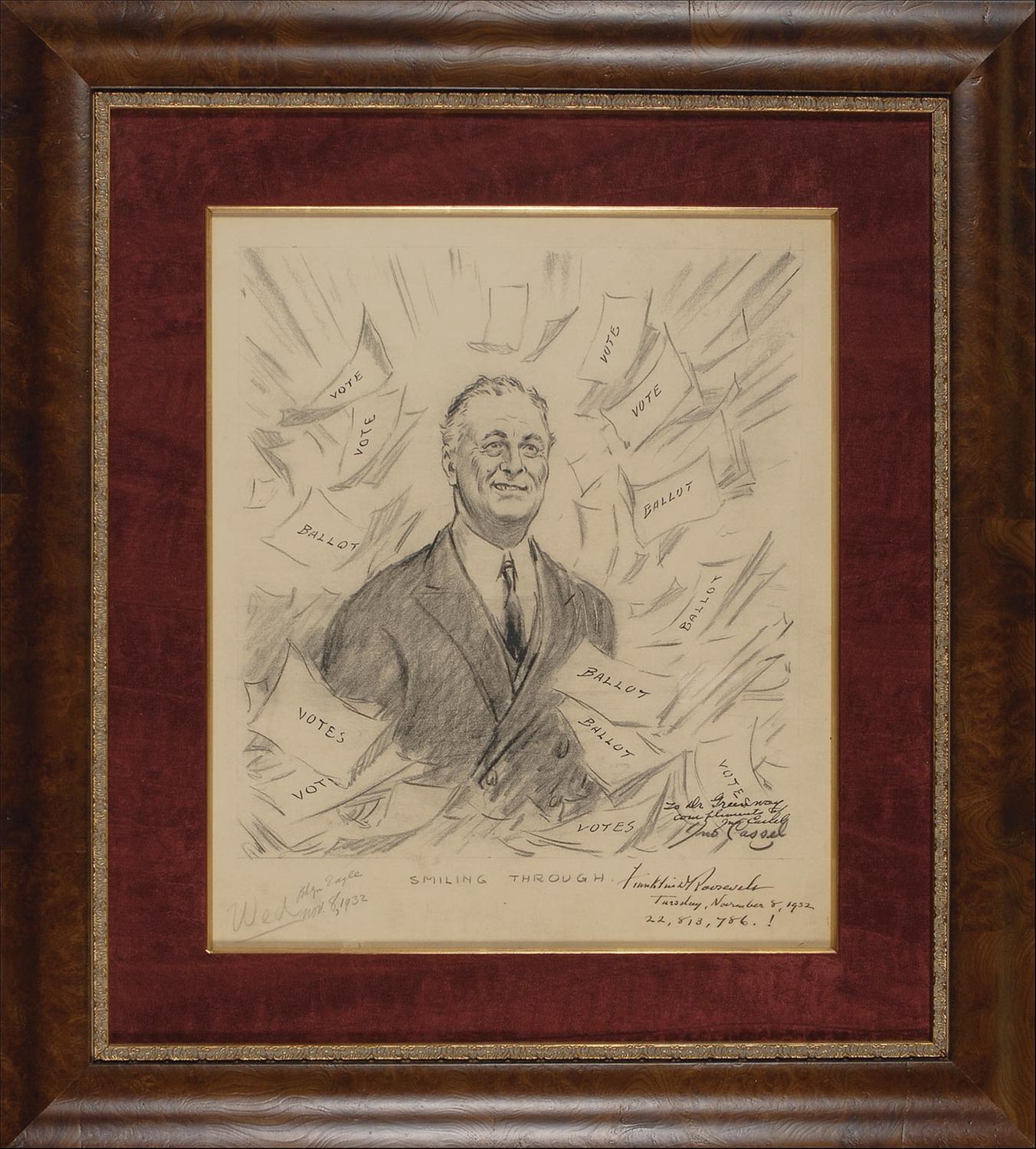 Superlative, one-of-a-kind original political cartoon of a half-smiling FDR buried up to his chest in an avalanche of ballots, titled ‘Smiling Through,’ charcoal and ink on artist’s board, 13.5 x 15.75, boldly signed in fountain pen, “Franklin D. Roosevelt, Thursday, November 8, 1932, 22,813,786!” The cartoon, drawn for the election-night issue of Brooklyn Eagle by noted American artist John Cassel (1877–1960), is also signed in charcoal, “Jno. Cassel”; Cassel later presented the drawing with an ink inscription, “To Dr. Greenway, compliments of Jno. Cassel.” Suede matted and framed to an overall size of 22.5 x 25. In fine condition, with expected scattered light soiling, and a crease to lower right corner.