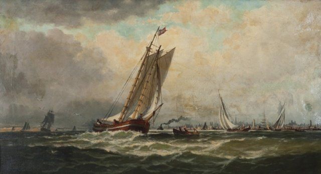 Brisco, Franklin Dullin (Penn., 1844-1903). Marine scene with sailboats. Oil on canvas. Signed l.l. "F.D. Briscoe". Simple gilt wood frame. 17 3/4" x 32 3/4". Frame: 22 1/4" x 36 1/4".