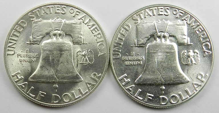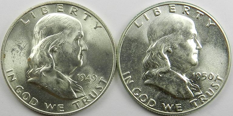 Franklin Half Dollar Pair. 1949-D and 1950. Both frosty white Choice BU, the second nearly Gem. Nice pair. 2 coins.