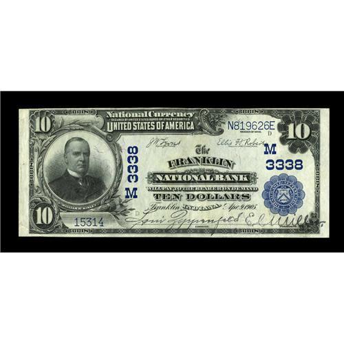 <B>Franklin, IN</B></I> - $10 1902 Plain Back Fr. 624 <B>The Franklin NB</B></I> Ch. # (M)3338<BR>This <B>About Uncirculated</B></I> $10 Plain Back comes so very close to a higher grade. It is bright and crispy and retains full strength stamped officers' signatures. It would be right at home in any collection of fully uncirculated Nationals.<BR><BR><b>Shipping:</b> Coin/Currency (<a target="_blank" href="http://www.heritageauctions.com/common/shipping.php">view shipping information</a>)