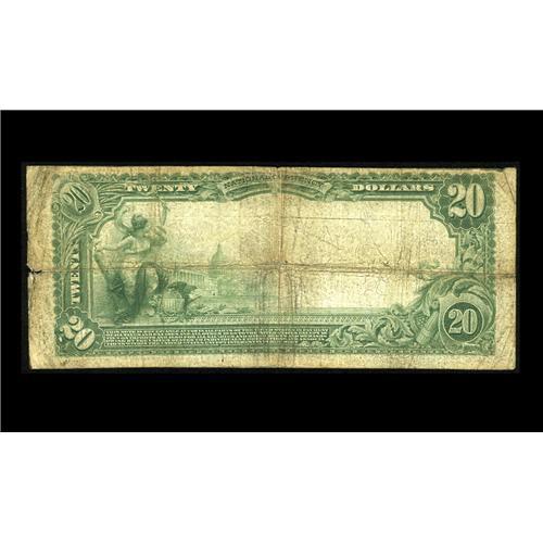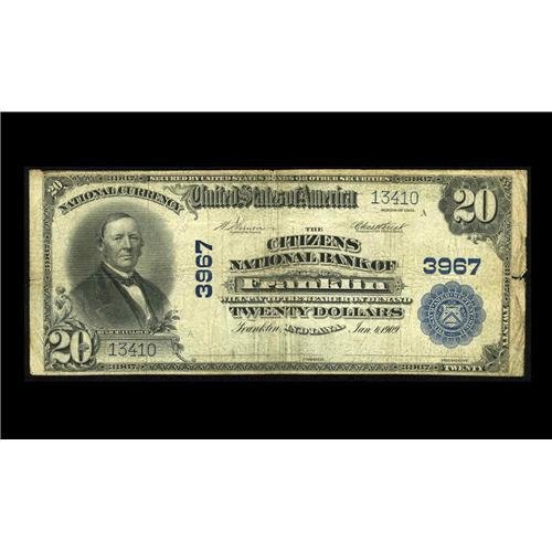 <B>Franklin, IN</B></I> - $20 1902 Plain Back Fr. 652 <B>The Citizens NB</B></I> Ch. # 3967<BR>We sold a Fine $10 Plain Back from here back in 2002 at our Rosemont auction for $431.25. This scarcer $20 should do better than that. Although seven banks received federal charters here at one time or another, only one was still functioning when the note issuing era came to a close. <B>Fine,</B></I> with an edge separation at right.