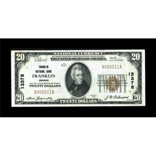 <B>Franklin, IN</B></I> - $20 1929 Ty. 1 <B>Franklin NB</B></I> Ch. # 13378<BR> An exciting new discovery for a bank that has only five notes in the census, this piece is far and away the best note now reported on this rare bank. While it faces up as uncirculated with deep embossing, a hint of a fold or two on the back forces us to call this pretty piece <B>About Uncirculated</B></I>.<BR><BR><b>Shipping:</b> Coins & Currency (<a target="_blank" href="http://www.heritageauctions.com/common/shipping.php">view shipping information</a>)