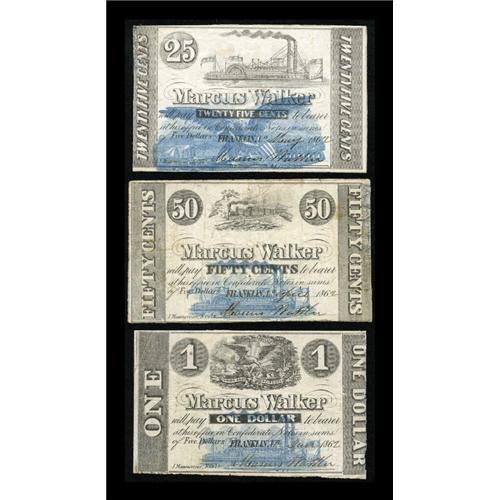 <B>Franklin, LA- Marcus Walker</B></I> 25c; 50c; $1 1862<BR> This is only the second time that we have had scrip from this issuer. This is also a complete set of this merchant's issue. This scarce issue was printed by J. Manouvrier of New Orleans. <B>Fine </B></I>or better.<BR><I>From The Collection of a Louisiana Gentleman</B></I><BR><BR><b>Shipping:</b> Coins & Currency (<a target="_blank" href="http://www.heritageauctions.com/common/shipping.php">view shipping information</a>)