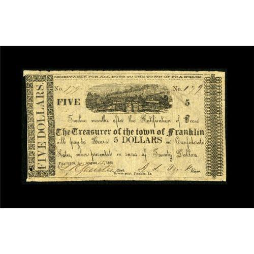<B>Franklin, LA- Town of Franklin</B></I> $5 Aug. 15, 1862<BR> The last example from this difficult to obtain location in the collection. <B>Very Fine</B></I><BR><I>From The Collection of a Louisiana Gentleman.</B></I><BR><BR><b>Shipping:</b> Coins & Currency (<a target="_blank" href="http://www.heritageauctions.com/common/shipping.php">view shipping information</a>)