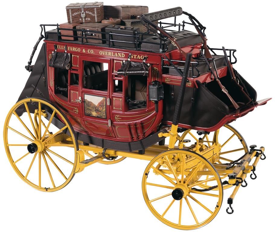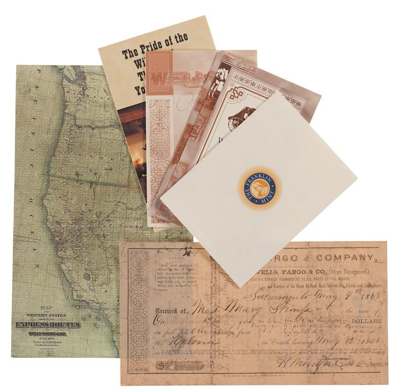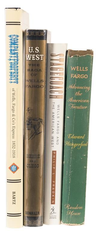 1) Franklin Mint production miniature Wells Fargo Overland Stage, 10 inches long and 4 inches wide, with nine pieces of luggage, 3 miniature shotguns, one miniature lever-action rifle, and an assortment of papers. 2) Four Books; Wells Fargo: Advancing the American Frontier by Hungerford, Stagecoach: Wells Fargo and the American West by Fradkin, U.S. West: The Saga of Wells Fargo by Beebe & Clegg and Company Property of Wells, Fargo & Co's Express 1852-1918 by Bartz.