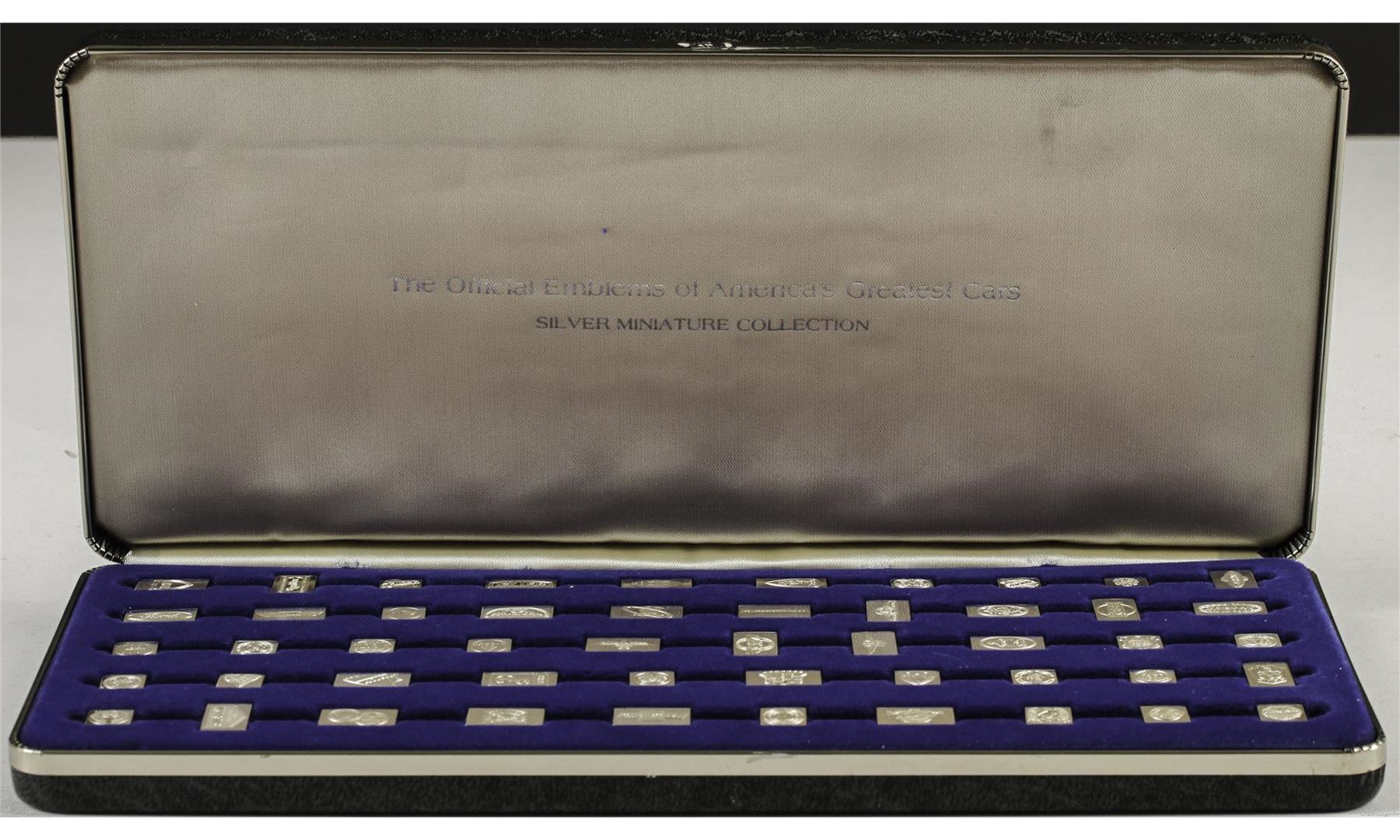 One Franklin Mint The Official Emblems of America's Greatest Cars Silver Miniature Collection. This collection comes in the original case so all of the pieces fit in properly and they are secure. There are 50 emblems total that are all solid sterling silver. The following emblems are marked as follows: Auburn, Dupont, Chrysler, Ford, Chevrolet, Stanley, Winton, Hupmobile, Studebaker, Mercer, Duesenberg, Marmon, Mitchell, Pontiac, Rickenbacker, Stutz, Durant, Willys, Cord, Cadillac, Moon, Hudson, Buick, Nash, Oakland, Packard, Stevens-Duryea, Thomas, Jordan, Chalmers, Detroit Electric, Franklin, Lincoln, Dodge, Lasalle, Peerless, Kissel, Oldsmobile, Pierce Arrow, Mc Fralan, Plymouth, Lozier, Locomobile, Apperson, Haynes, Rambler, Maxwell, Doble, and Cole. There are two different sizes of the figurines present. One is 15.6mm x 9.2mm, and the other ones are 9.4mm x 9.4mm. This is a great set and very hard to come by.