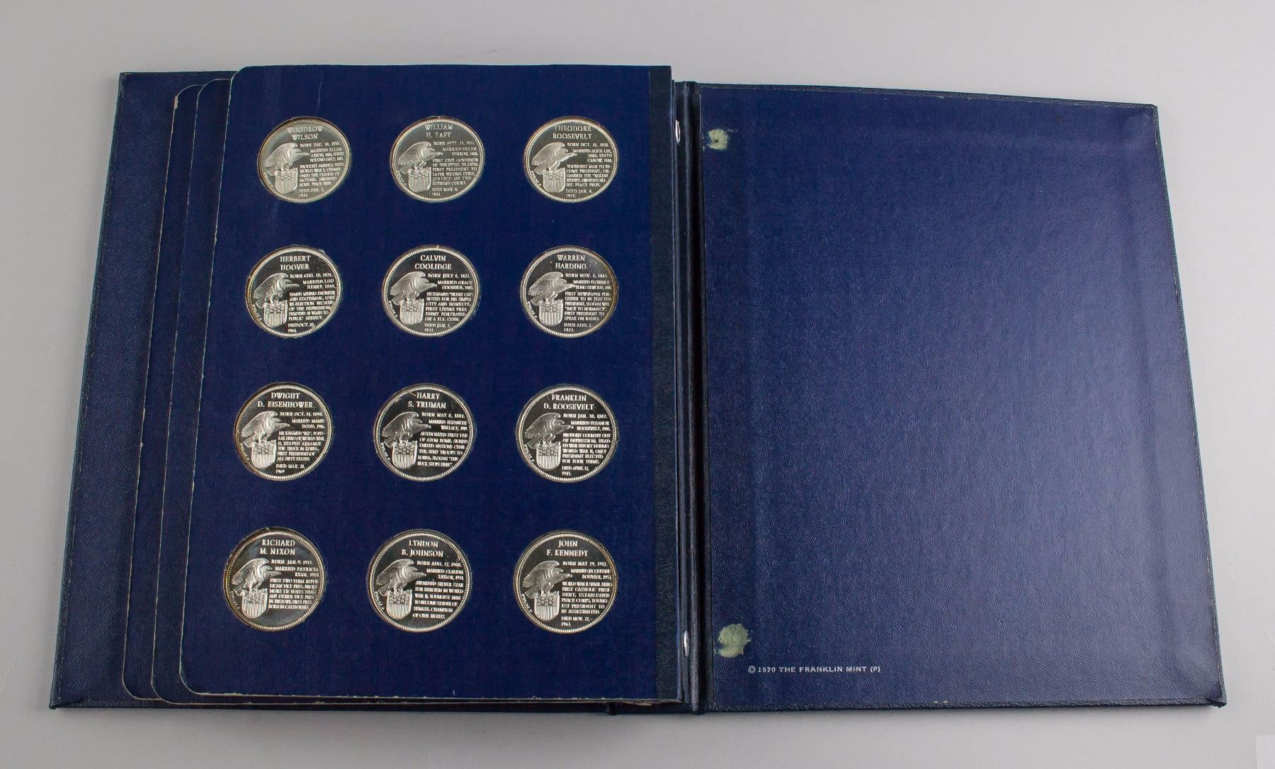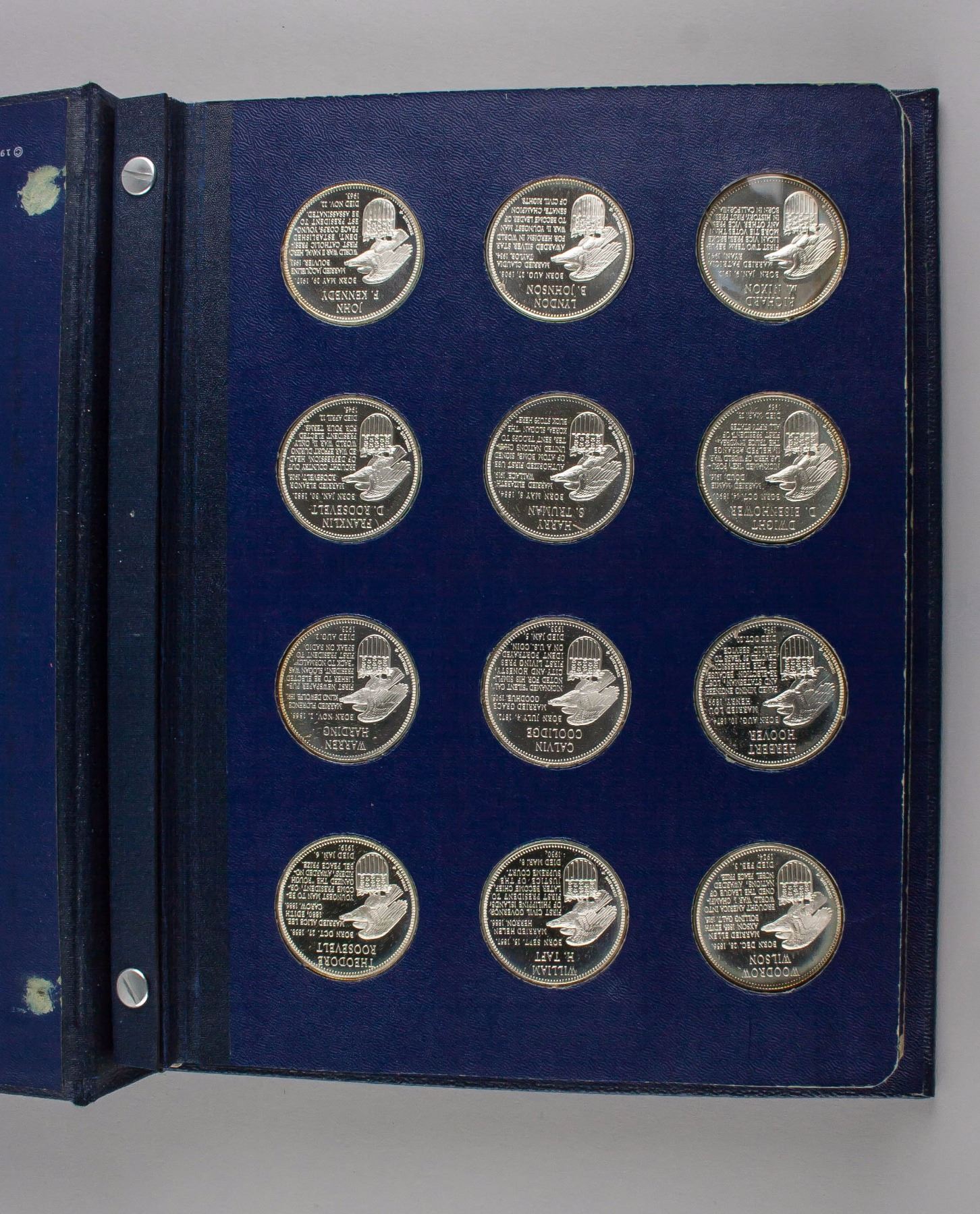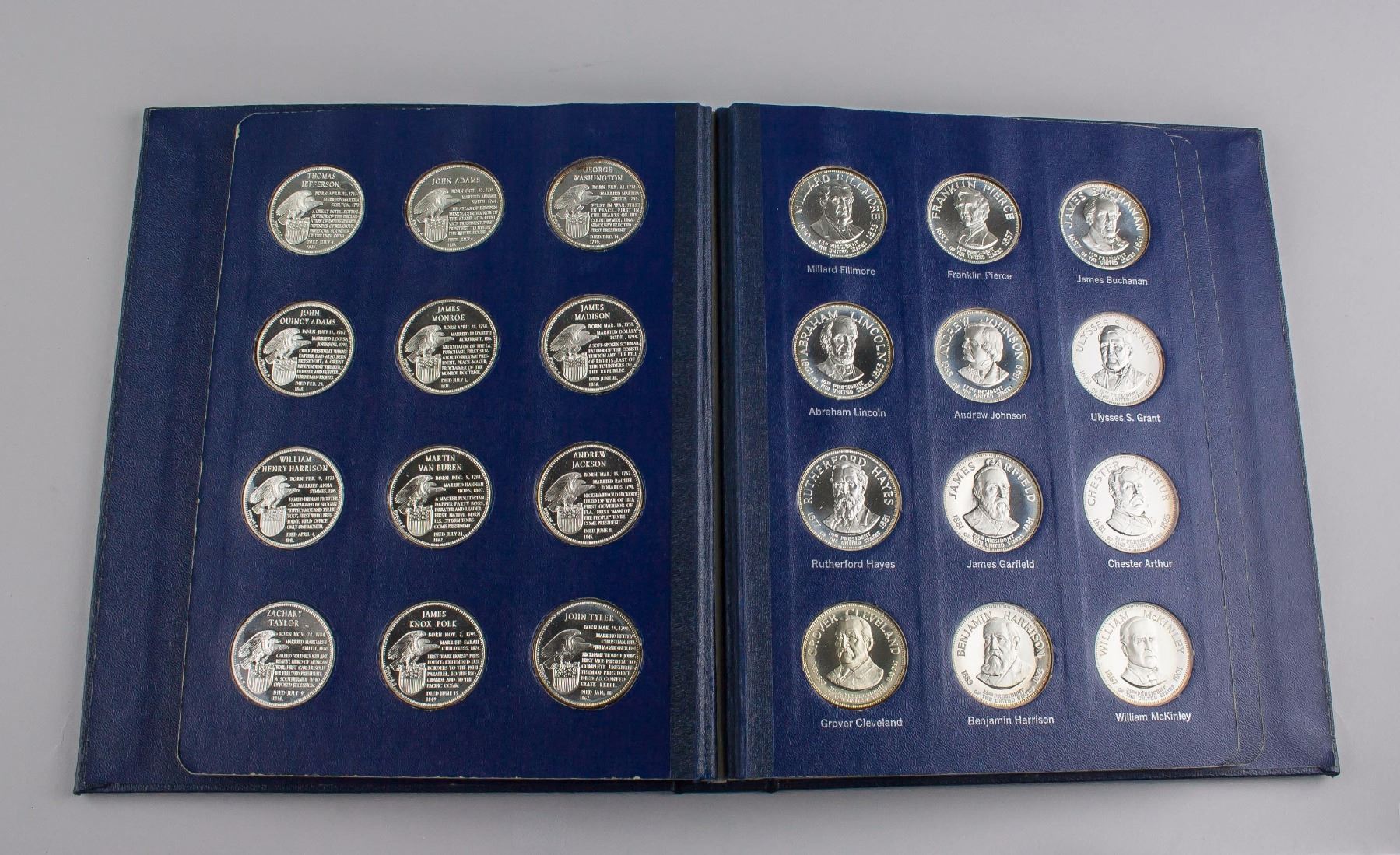 The Franklin Mint Treasure of Presidential Commemorative Medals American Express Edition; comprised of 36 sterling silver medals of presidents of United States from George Washington to Richard Nixon; mintage 63224, each size 39 mm; year issued 1967-70; whole book dimension L: 27 cm, W: 21.7 cm, T: 3.6 cm, 2034 grams