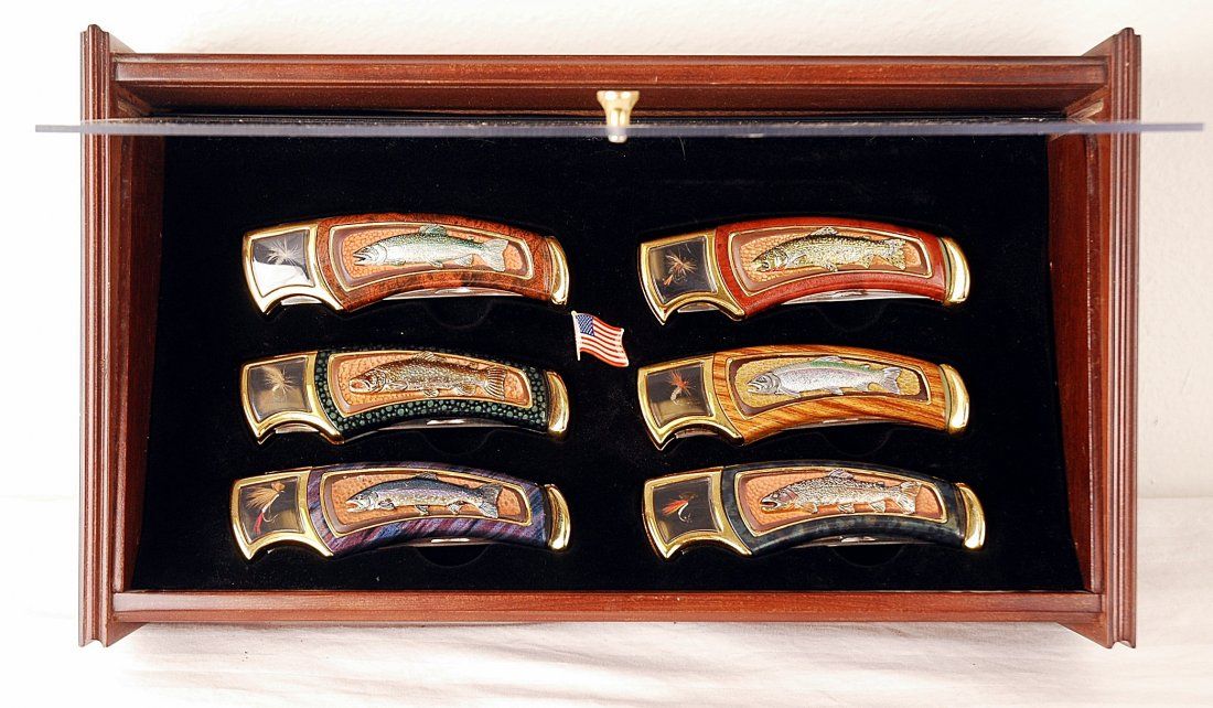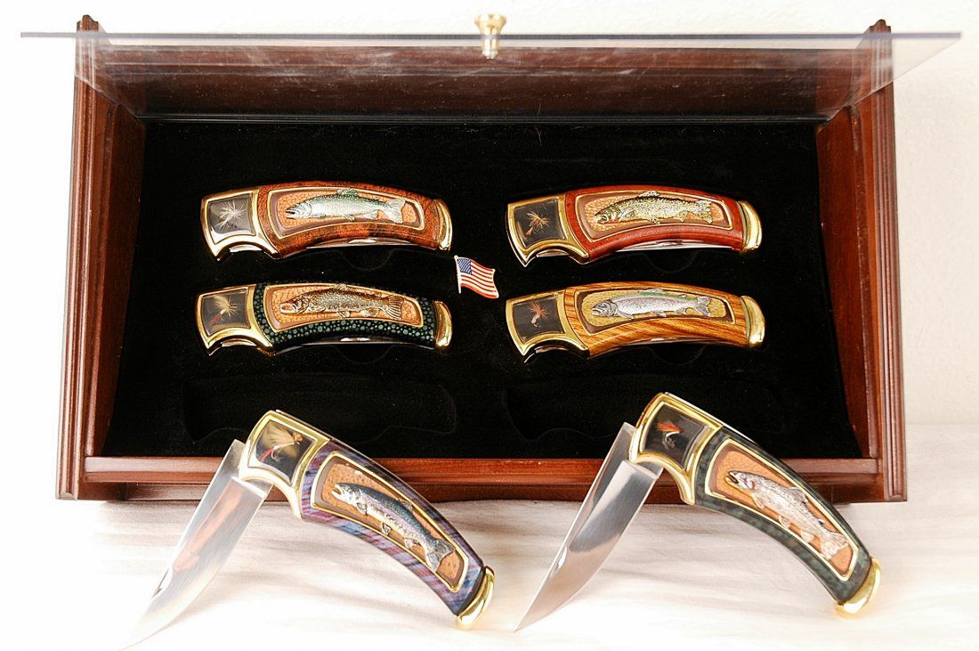 6pc The Rainbow Trout Collector Knife Set , This collector knife set features the sculptured depiction of a rainbow trout set upon a handle finished with the look of real wood. The blades are stainless steal. Knife size is aproximately 8" long when opened. Comes with a Franklin Mint display box 13.5" x 7.5"