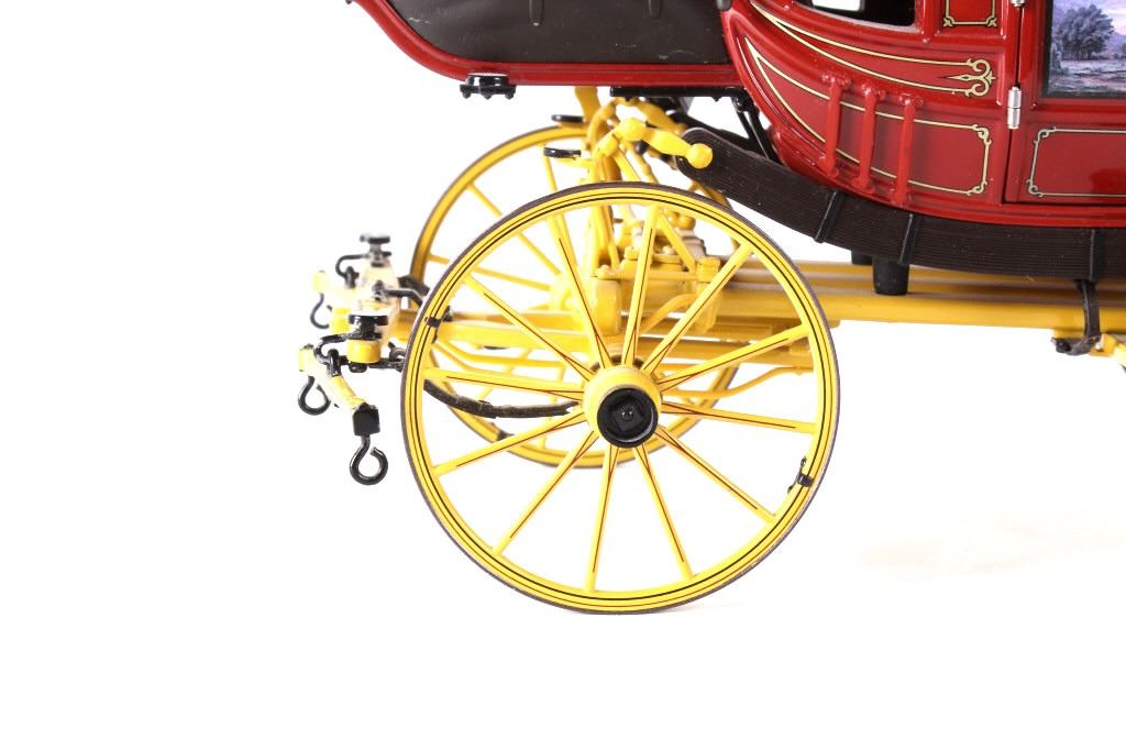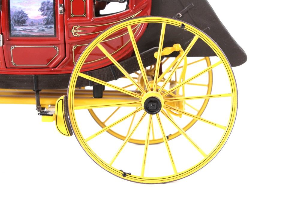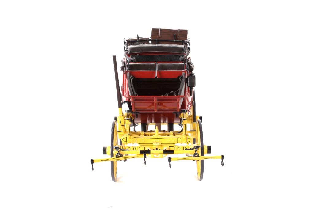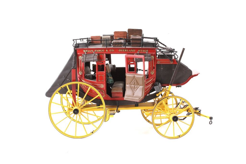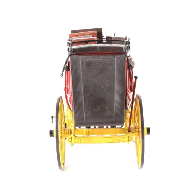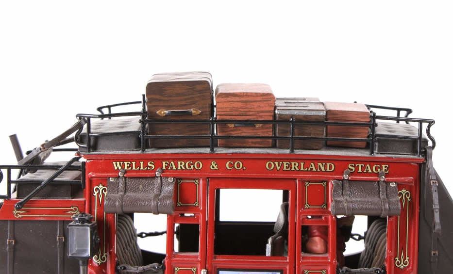 Offered for your bidding pleasure is this Franklin Mint 1868 Wells Fargo & Co Overland Stage Model Stagecoach. The piece shows a sturdy die cast construction with hand painted accents and added decals. The piece even shows a functioning suspension and rolling wheels with miniature luggage, riffles, shotguns and trunks. This item shows excellent condition and wonderful detail. It measures 10" long by 5" wide by 7" tall.