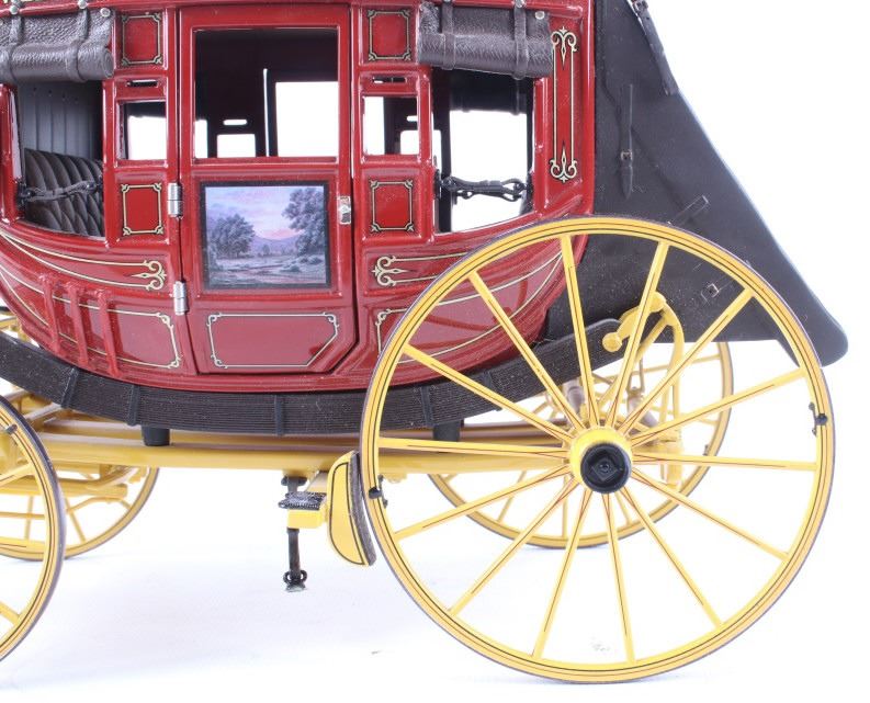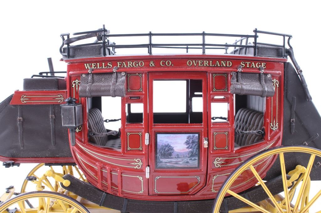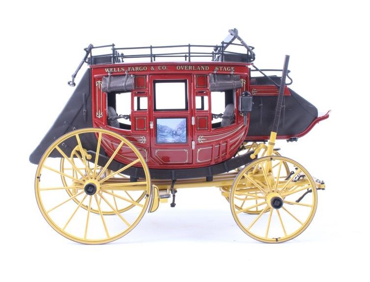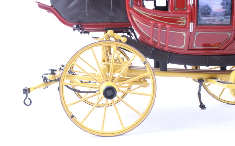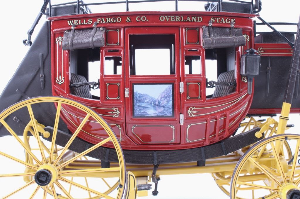 Offered for your bidding pleasure is this Franklin Mint 1868 Wells Fargo & Co Overland Stage Model Stagecoach. The piece shows a sturdy die cast construction with hand painted accents and added decals. The piece even shows a functioning suspension and rolling wheels with miniature luggage, riffles, shotguns and trunks along with a woman and two children. Some pieces of the piece have broken off but are still set aside with this item. This item is in mint condition and good detail. It measures 10" long by 5" wide and 7" tall.