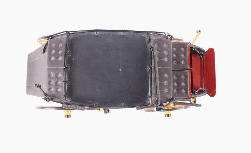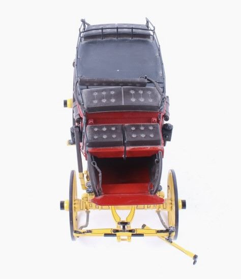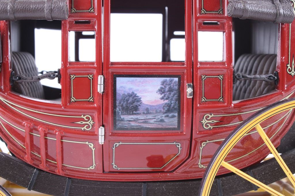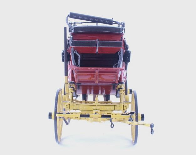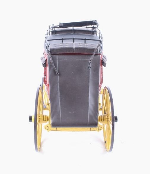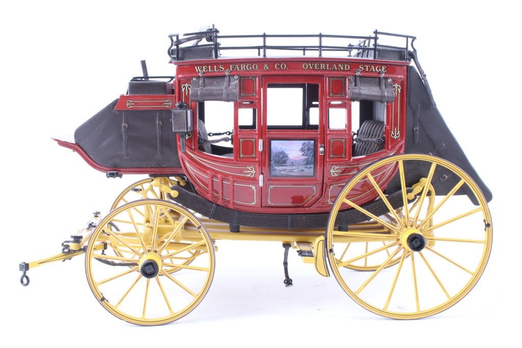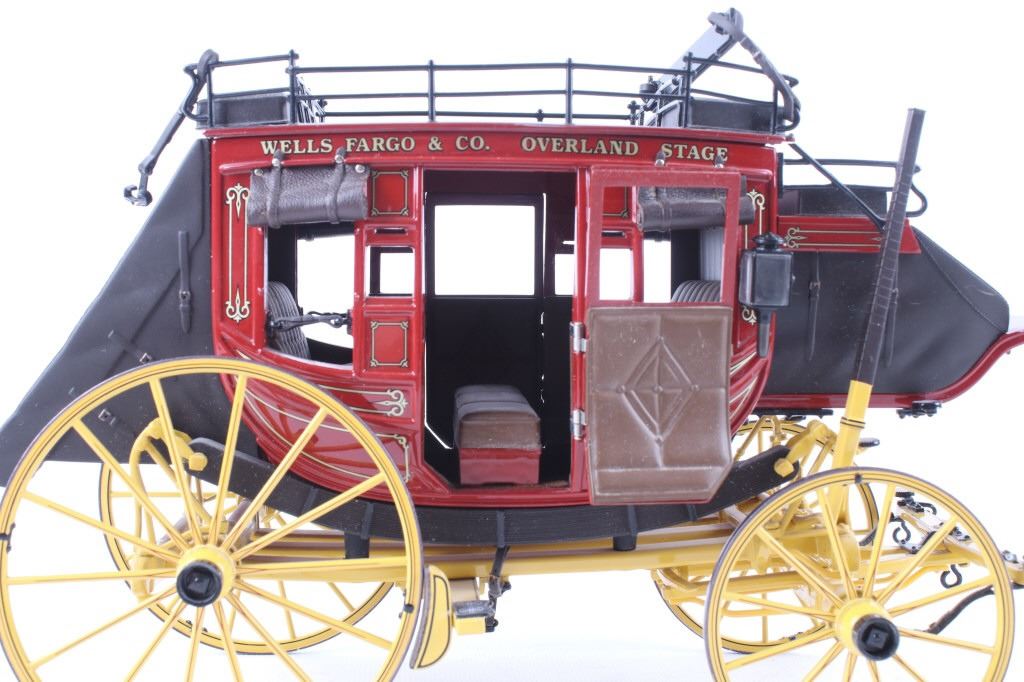 Offered for your bidding pleasure is this Franklin Mint 1868 Wells Fargo & Co Overland Stage Model Stagecoach. The piece shows a sturdy die cast construction with hand painted accents and added decals. The piece even shows a functioning suspension and rolling wheels with miniature luggage, riffles, shotguns and trunks along with a woman and two children. Some pieces of the piece have broken off but are still set aside with this item. This item is in mint condition and good detail. It measures 10" long by 5" wide and 7" tall.