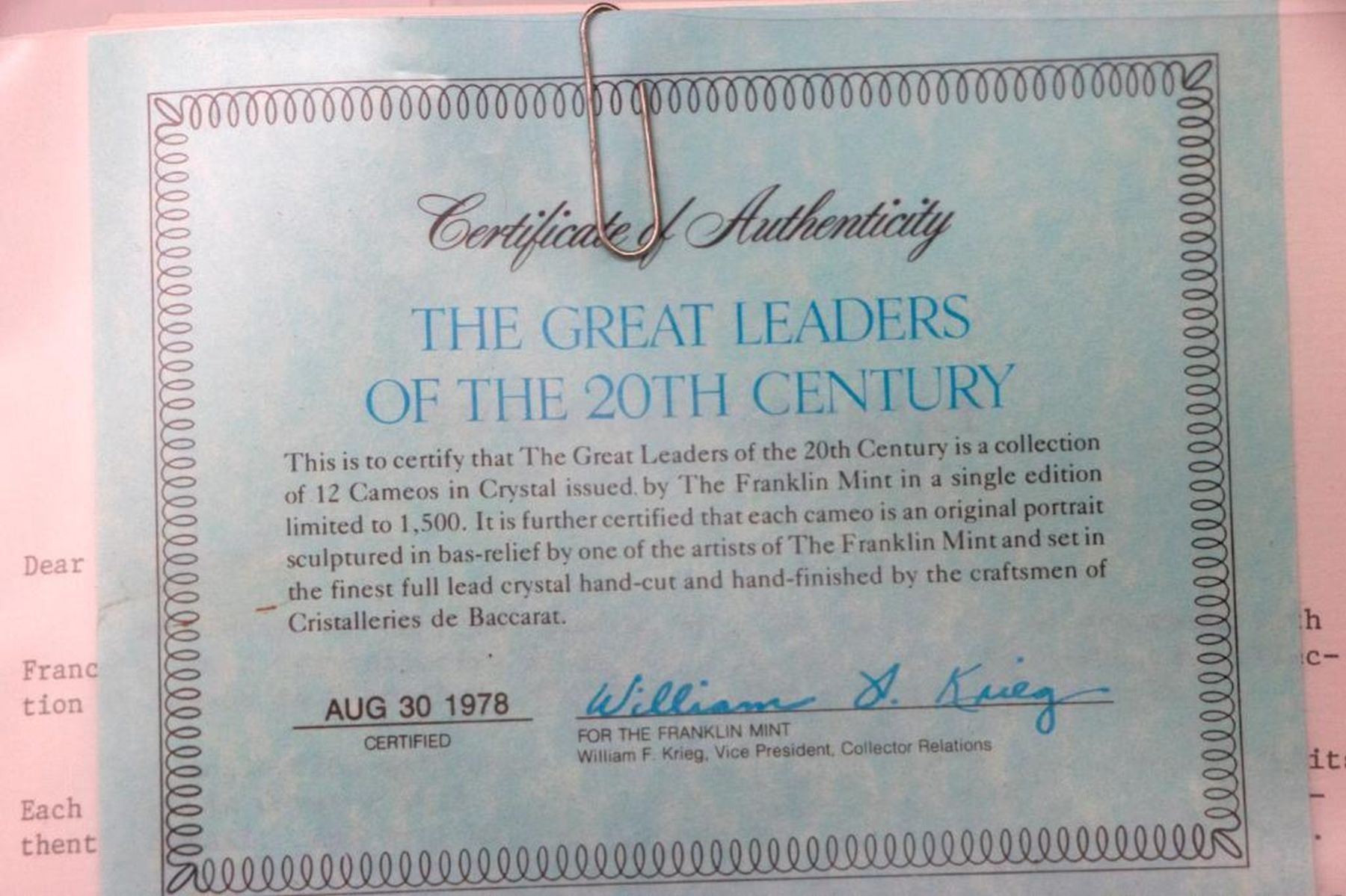 The 12 Franklin mint cameos of The Franklin Mint "The Great Leaders of the 20th Century" collection and a Sevres cameo from The Daughters of the American Revolution, limited addition.