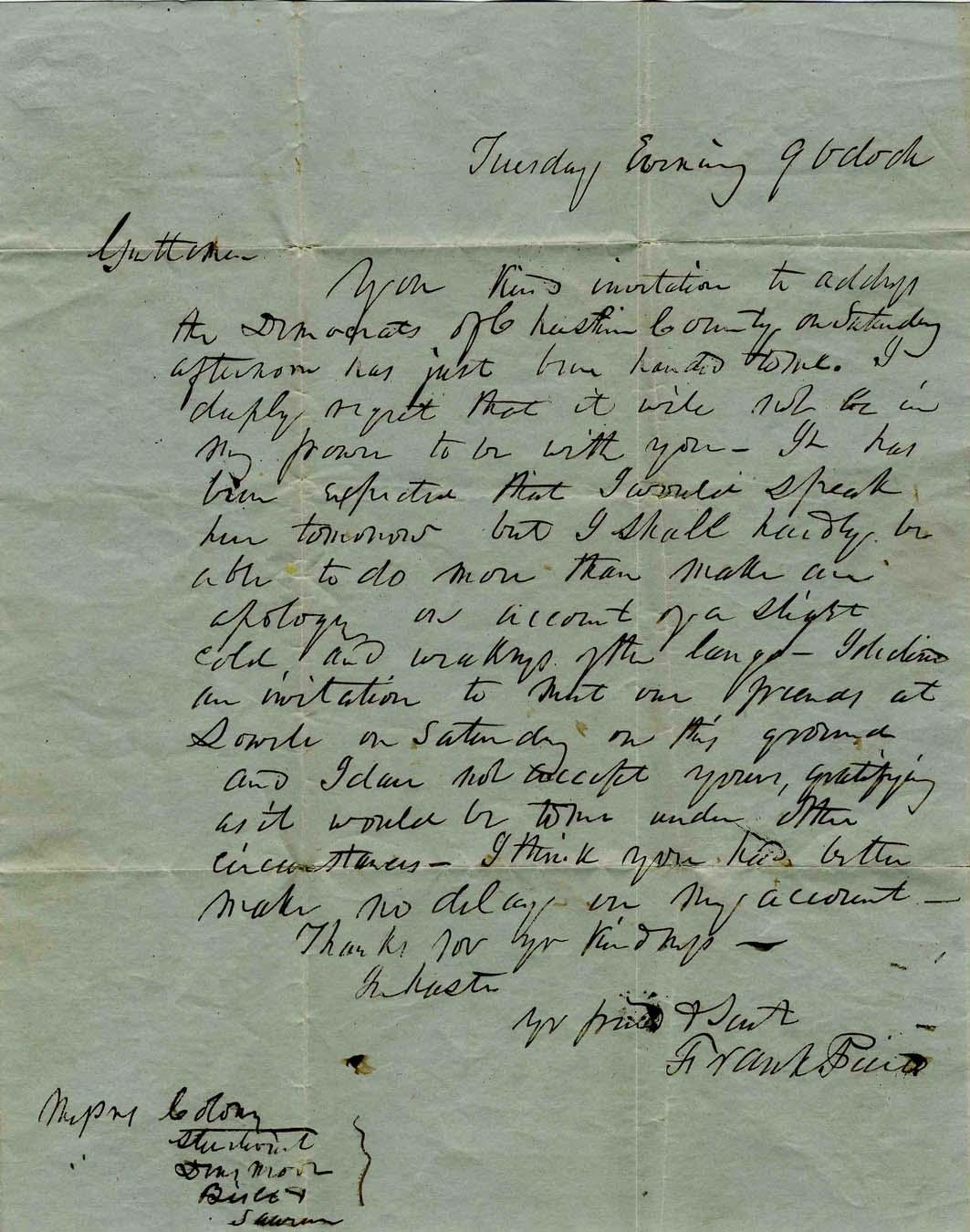 Franklin Pierce autograph letter signed, dated ''Thursday Evening 9 o'clock'' no year, though likely as Presidential candidate. Letter addressed to Col. M. Dinsmore, Keene, NH reads in part: ''…Your kind invitation to address the Democrats…has just been handed to me. I deeply regret that it will not be in my power…on account of a slight cold and weakness of the lungs…Yr. friend & serv’t., Frank. Pierce.'' Ink letter and integral cover measures 7.75'' x 9.75''. Usual mailing folds and light sunning to address leaf, otherwise excellent.