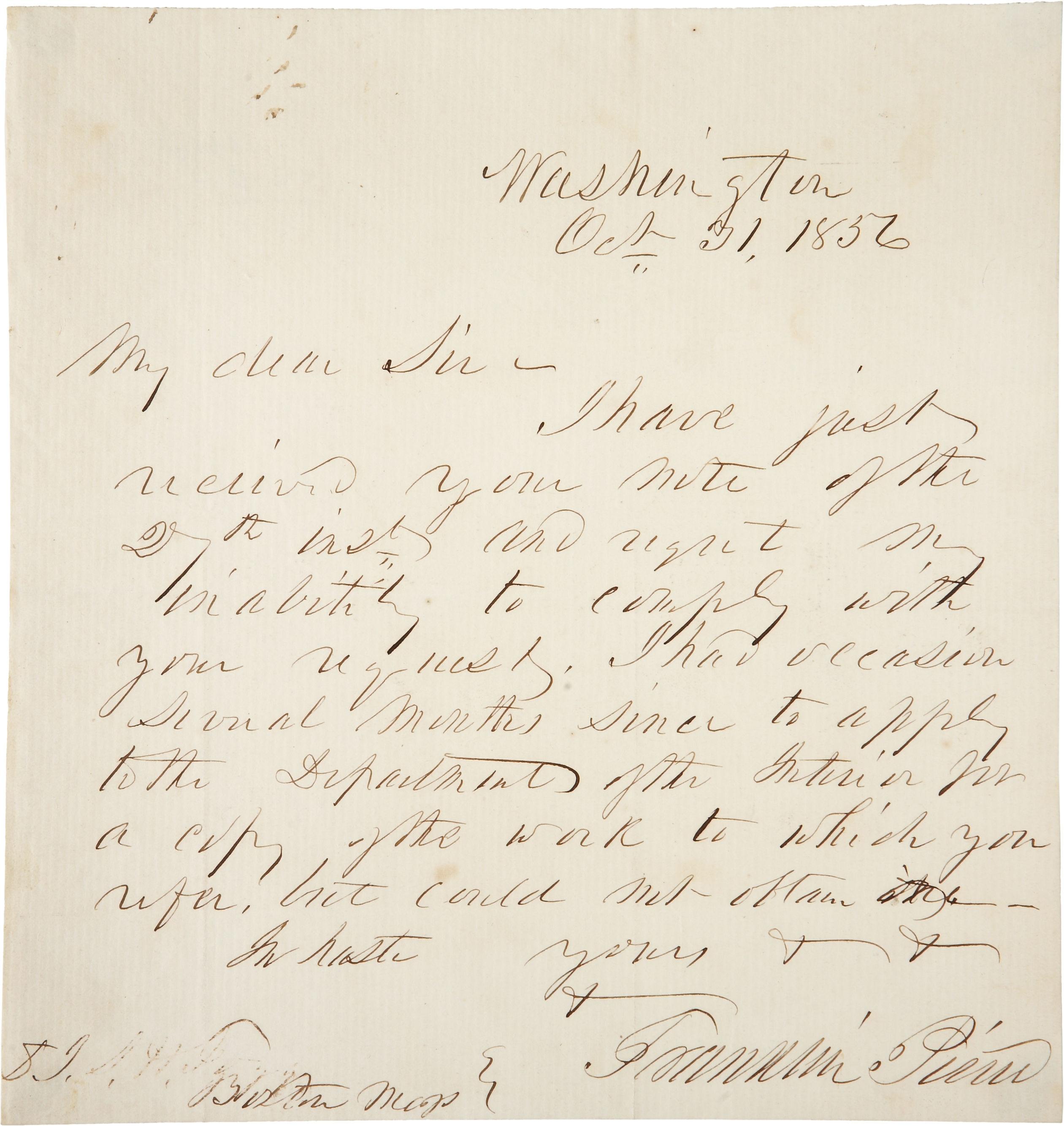 Franklin Pierce autograph letter signed as President from Washington, dated 31 October 1856. Addressed to John Samuel Hill Fogg of Boston, letter reads in part: ''…I had occasion several months since to apply to the Department of the Interior for a copy of the work to which you refer, but could not obtain one…Franklin Pierce.'' Pierce is probably referring to reports regarding Native Americans, Fogg's area of interest. Single page measures 7.5'' x 8''. Large, bold script. Mounting traces on verso, else excellent.