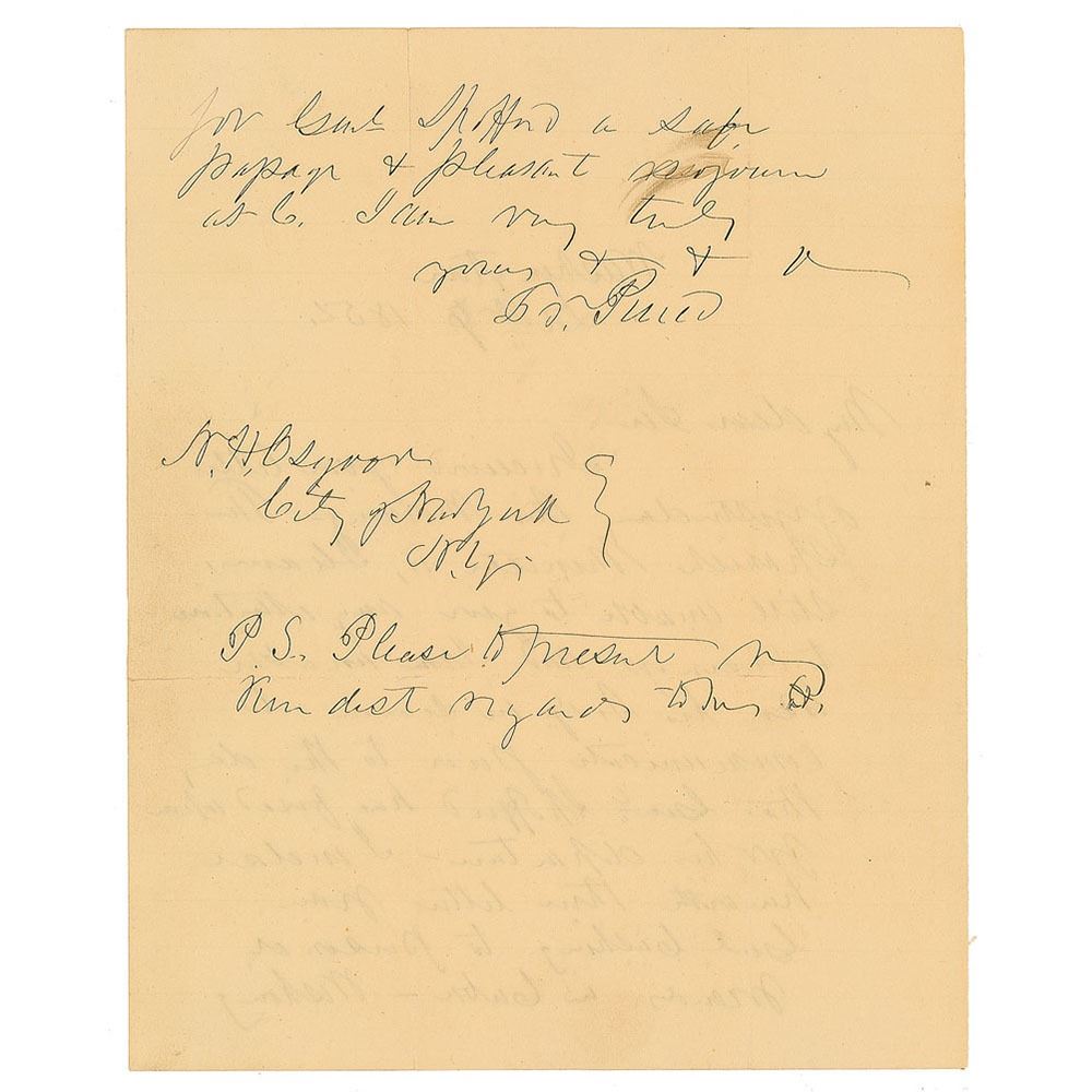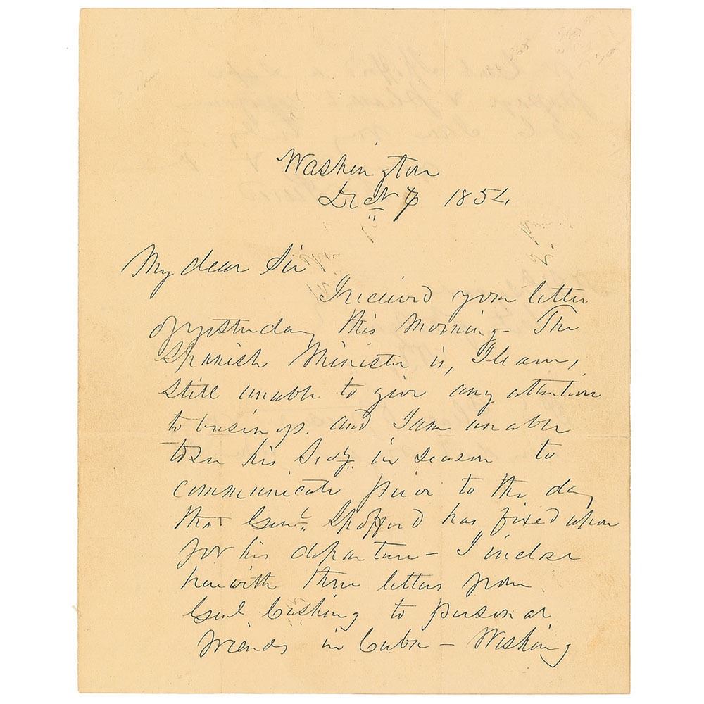 ALS as president, signed “Fr. Pierce,†one page both sides, 5.75 x 7, December 7, 1854. Handwritten letter to N. H. Osgood in New York. In part: “The Spanish Minister is, I learn, still unable to give any attention to business and I am unable to see his Secy in season to communicate prior to the day that Genl. Spofford has fixed upon for his departure—I inclose herewith three letters from Genl. Cushing to personal friends in Cuba—Wishing for Genl. Spofford a safe passage & pleasant sojourn.†In fine condition, with intersecting folds with one small edge separation and brushing to ink in a couple words. Provenance: The Everett Fisher Collection. One goal of the Pierce administration was to purchase Cuba from Spain, and the Ostend Manifesto was drafted in 1854 to describe the rationale. The plan came under attack for its advocacy of military intervention if Spain refused as well as its intention to make Cuba a ‘slave’ state. The public outcry forced Pierce to shelve his plans to annex Cuba and dealt a severe blow to his administration.