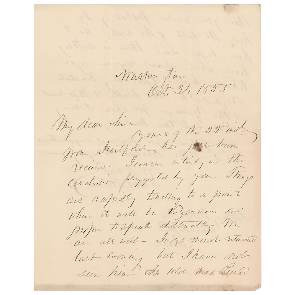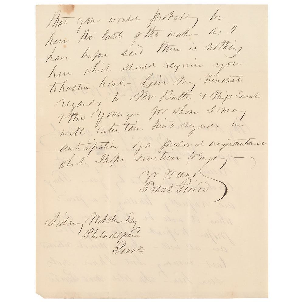 ALS as president signed “Frank. Pierce,†one page both sides, 8 x 10, October 24, 1855. Handwritten letter to his private White House secretary Sidney Webster, in full: "Yours of the 22nd inst. from Hartford has just been received. I concur entirely in the conclusion suggested by you. Things are rapidly tending to a point when it will be ingenuous and proper to speak distinctly. We are all well. Judge Minot returned last evening but I have not seen him. He told Mrs. Pierce that you would probably be here the last of the week. As I have before said there is nothing here which should require you to hasten home. Give my kindest regards to Mr. Butler & Miss Sarah & the younger for whom I may well entertain kind regards in anticipation of a personal acquaintance which I hope sometime to enjoy." In fine condition.