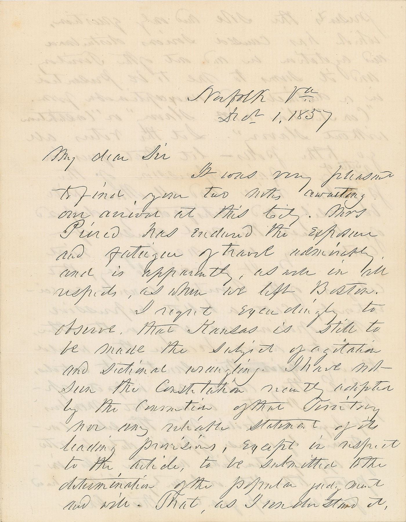 ALS, four pages on two adjoining sheets, 7.75 x 10, December 1, 1857. Letter to Sidney Webster, his former private White House secretary, on the subjects of the Constitution and statehood for Kansas, written nine months after leaving office. In part: "I regret exceedingly to observe that Kansas is still to be made the subject of agitation and sectional wrangling. I have not seen the Constitution recently adopted by the Convention of that Territory nor any reliable statement of its leading provisions, except in respect to the article, to be submitted to the determination of the popular judgement and will. That, as I understand it, presents the sole and only question, which has caused serious disturbance and agitation in and out of the Territory and it seems to me to be presented in a distinct and unexceptionable form. ‘Constitution with Slavery’ or ‘Constitution without Slavery.’ Let the voters all go to the polls—let that question be settled by a fair expression of the popular voice and all others will be easily and satisfactorily disposed of because the real cause of controversy will no longer exist.