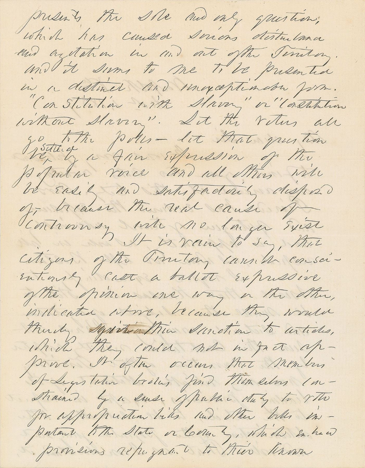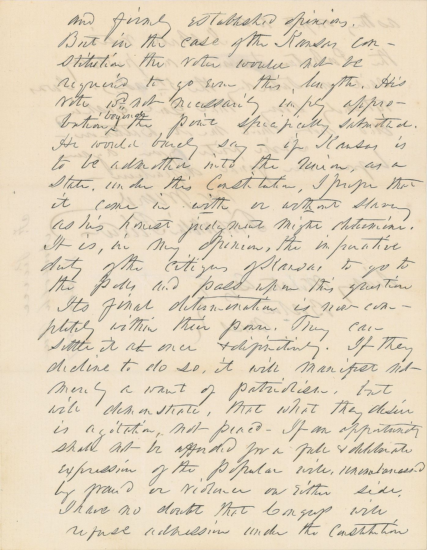 It is vain to say, that citizens of the Territory cannot conscientiously cast a ballot expressive of the opinion one way or the other, indicated above, because they would thereby give their sanction to articles, which they could not in fact approve. It often occurs that members of Legislative bodies find themselves constrained by a sense of public duty to vote for appropriation bills and other bills important to the state or county, which eschew provisions repugnant to their known and firmly established opinions. But in the case of the Kansas constitution the voter would not be required to go even this length. His vote w’d not necessarily imply approbation beyond the point specifically submitted. He would barely say, if Kansas is to be admitted into the Union as a state under this Constitution, I prefer that it come in with or without slavery as his honest judgement might determine. It is, in my opinion, the imperative duty of the citizens of Kansas to go to the polls and pass upon this question. Its final determination is now completely within their power. They can settle it at once & definitively. If they decline to do so, it will manifest not merely a want of patriotism, but will demonstrate, that what they desire is agitation, not peace. If an opportunity shall not be afforded for a full & deliberate expression of the popular will, unembarrassed by fraud or violence on either side, I have no doubt that Congress will refuse admission under the Constitution as they ought to do.