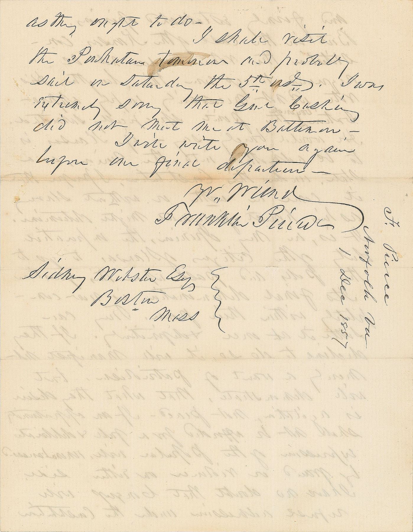 Because of the political discord that marked Pierce’s presidency, the Democratic Party failed to nominate him for reelection. After leaving Washington, he briefly returned to his native New Hampshire before setting off on a three-year tour of Europe (aboard the Powhatan, mentioned in this letter) and the Bahamas. From afar he managed to stay abreast of American affairs and maintained an extensive correspondence with Webster, a New Hampshire native who, after graduating from Yale University and Harvard Law School, became President Pierce’s private secretary.