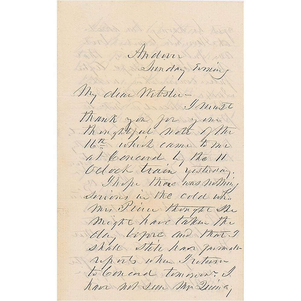 ALS, three pages on two adjoining sheets, 4.75 x 7.5, April 19, 1857. Letter to his former private White House secretary Sidney Webster, written from Andover, Mass., 46 days after leaving the presidency, in part: "I must thank you for your thoughtful note of the 16th which came to me at Concord by the 11 o'clock train yesterday. I hope there was nothing serious in the cold which Mrs. Pierce thought she might have taken the day before and that I shall still have…reports when I return to Concord tomorrow. I have not seen Mr. Quincy yet he having been absent at Haverhill Court, but am fully satisfied that my debt is safe. After full conversation with Judge Minot & my brother I have decided not to purchase a large farm at least for the present, but have given a pretty thorough examination to certain parcels of real estate about which I shall converse with Mrs. Pierce & you when I return. Peter Dunbar wrote me last Wednesday that the horses had arrived safely at Boston after a very rough passage and that he had advised Henry to let them rest for three days before starting for Concord. I had heard nothing more from them up to the hour that I left for this place yesterday. I think they can hardly fail to be at Concord tomorrow and in that event I shall leave for Philadelphia Thursday—I can report my conversation with Judge Minot better when we meet than by letter—He was grateful that I had thought of it but saw objections so far as you are concerned." In fine condition. Josiah Minot (1818–1891) was a law partner of Pierce between the years 1844 and 1852. Pierce, who had a talent for making money as a lawyer but not for retaining it, later entrusted Minot, a first-class businessman and manager, to oversee all of his finances and investments. When Pierce became president in 1853, Minot accompanied him to Washington and, in due time, was appointed as Auditor of the Treasury, and then, as Commissioner of Patents.