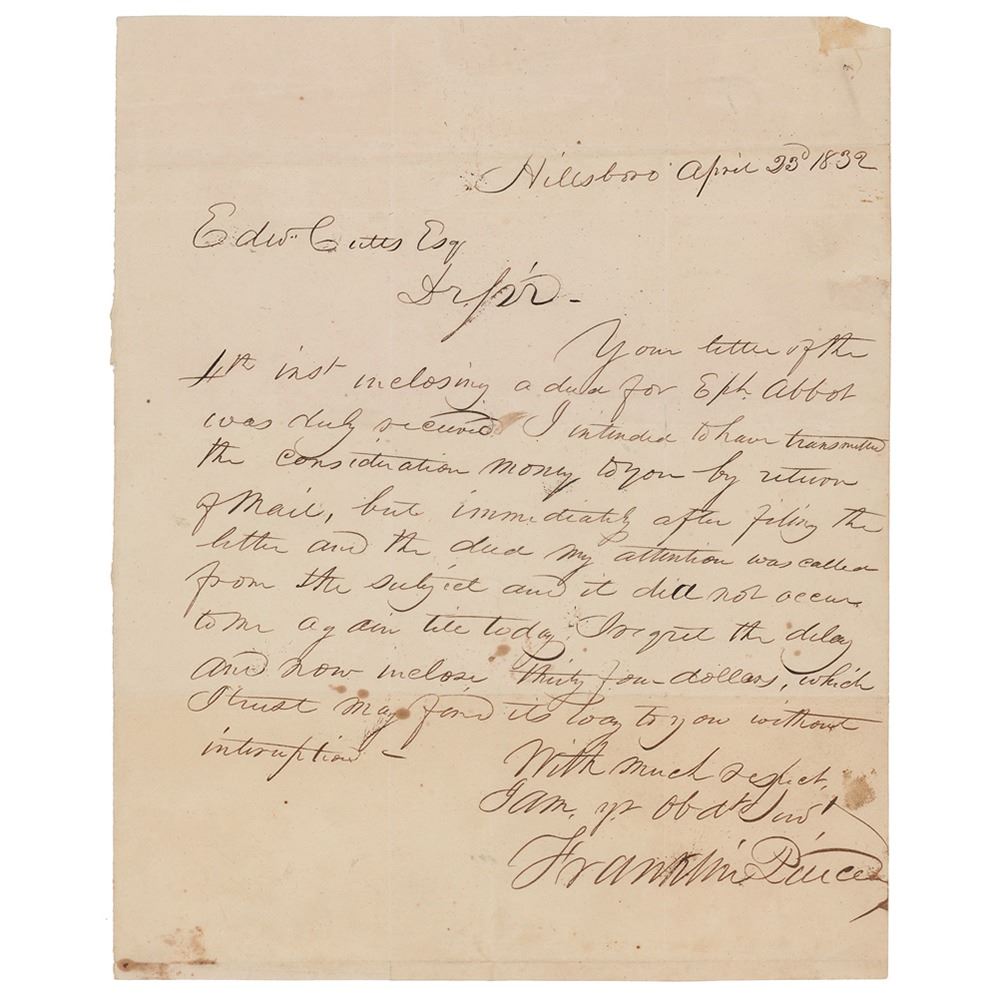 ALS, one page, 8 x 10, April 23, 1832. Handwritten letter to Edward Cutts, in part: "Your letter of the 4th inst. enclosing a deed for Eph. Abbot was duly received. I intended to have transmitted this consideration money to you by return of Mail, but immediately after filing the letter and the deed my attention was called from the subject and it did not occur to me again till today." In very good to fine condition, with overall creasing and scattered small stains.