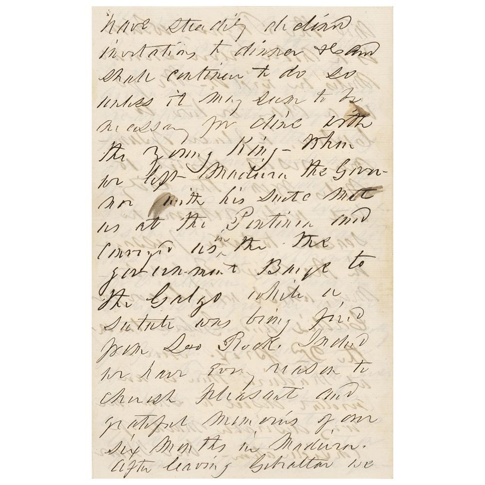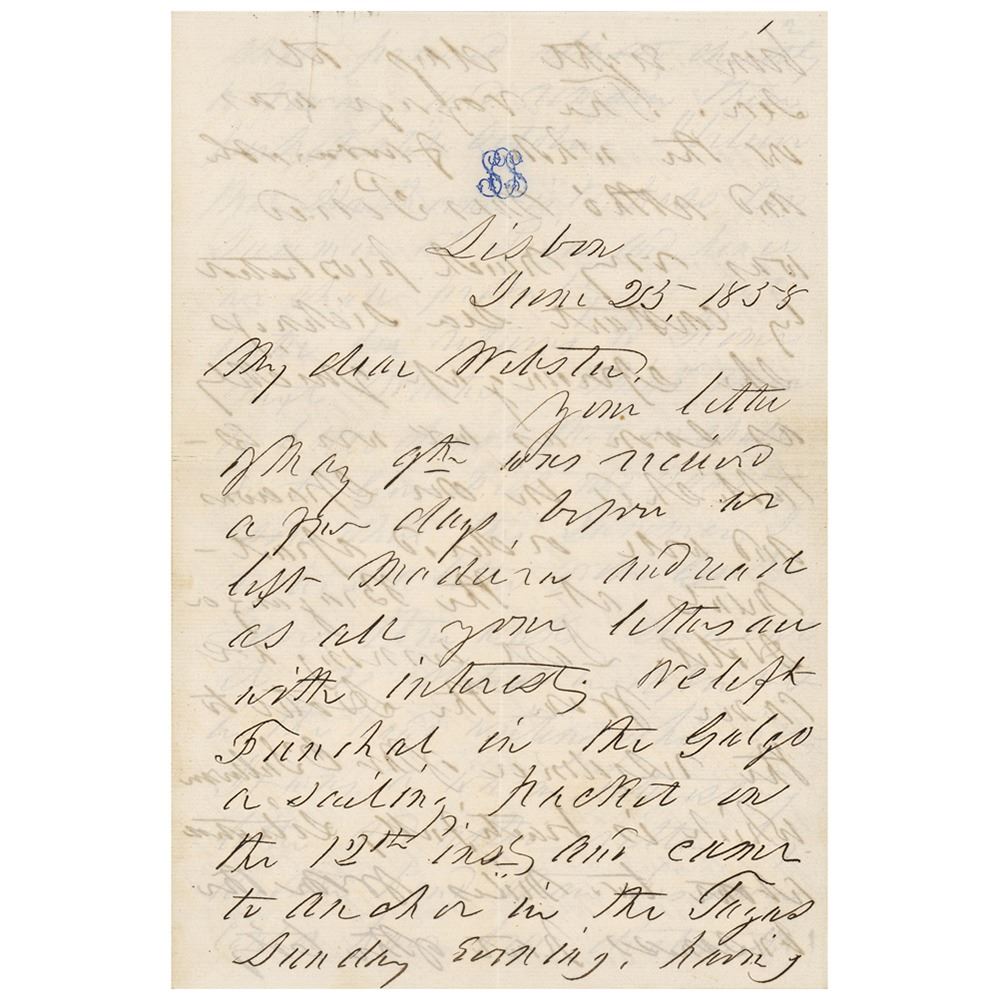 ALS, twelve pages on three sets of adjoining sheets, 5.25 x 8.25, June 25, 1858. Letter to Sidney Webster, his former private White House secretary, written from Lisbon, Portugal. In part: "Your letter of May 9th was received a few days before we left Madeira and read as all your letters are with interest. We left Funchal in the Galgo a sailing packet on the 12th inst. and came to anchor it in the Tagus Sunday evening, having been eight days at sea. The voyage was on the whole favorable and altho' Mrs. Pierce was very much prostrated by constant sea sickness she sprung up quickly as soon as we were established in our spacious and well ordered apartment at the Braganza Hotel. Last evening we came from the hotel to the residence of Mr. O'Sullivan which is beautifully situated about two miles from the business part of this city and the Tagus, which is a…river several miles in width. We go in a day or two to Cintra [Sintra], a place of summer resort about 18 miles from the city, but will return in season to take passage in the next English steamer which will leave for Cadiz and Gibraltar the 2nd prox. here as at Madeira there is an evident desire to show me every desirable mark of consideration, but I have steadily declined invitations to dinner etc. and shall continue to do so unless it may seem to be necessary to dine with the young king. When we left Madeira the governor with his suite met us…and conveyed us in the government barge to the Galgo while a salute was being fired from Loo Rock. Indeed we have every reason to cherish pleasant and grateful memories of our six months in Madeira.