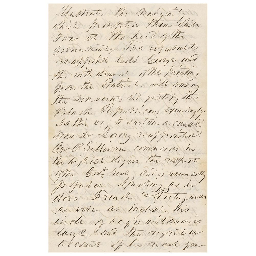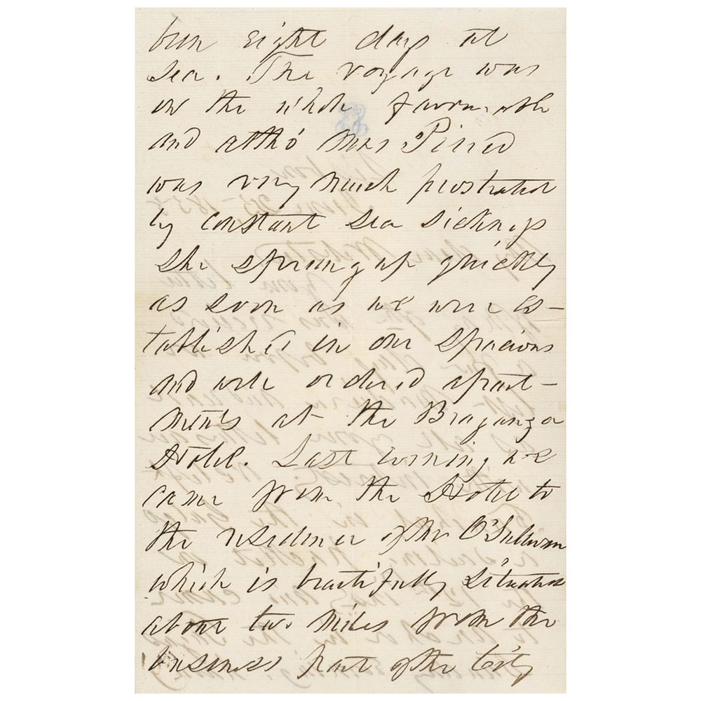Pierce penned this lengthy letter at the beginning of his stay in Madeira in the company of John Louis O'Sullivan, a Democrat and American newspaper columnist best remembered for coining the term 'manifest destiny.' He served as American minister to Portugal under Pierce, and although he opposed the Civil War, ultimately supported the Confederacy, printing pamphlets in support of the secessionist cause. The stationery Pierce uses here is the monogrammed letterhead of O'Sullivan's wife, Susan. A superb, crisply penned epistle from the former president's time abroad.