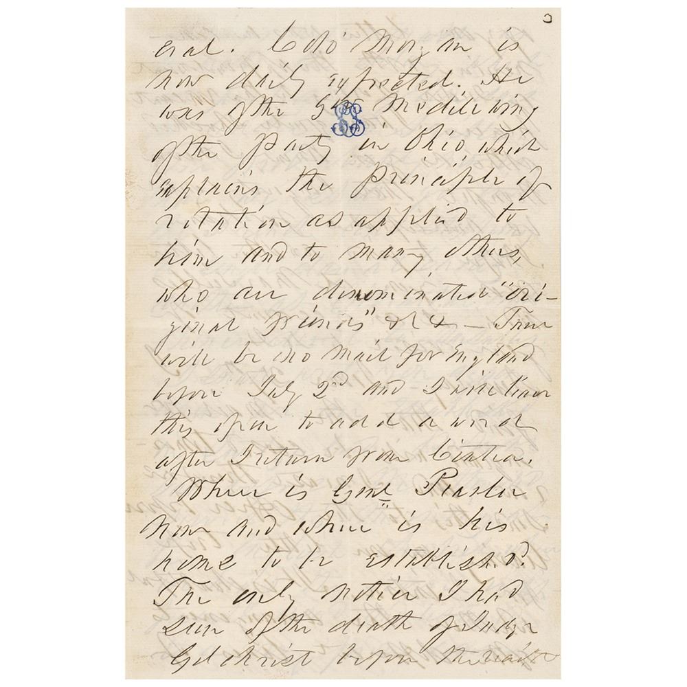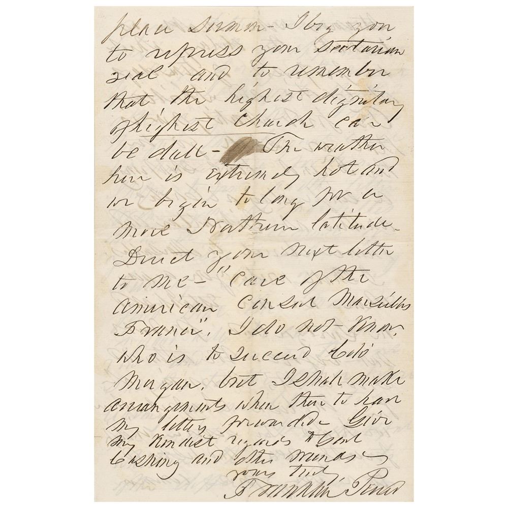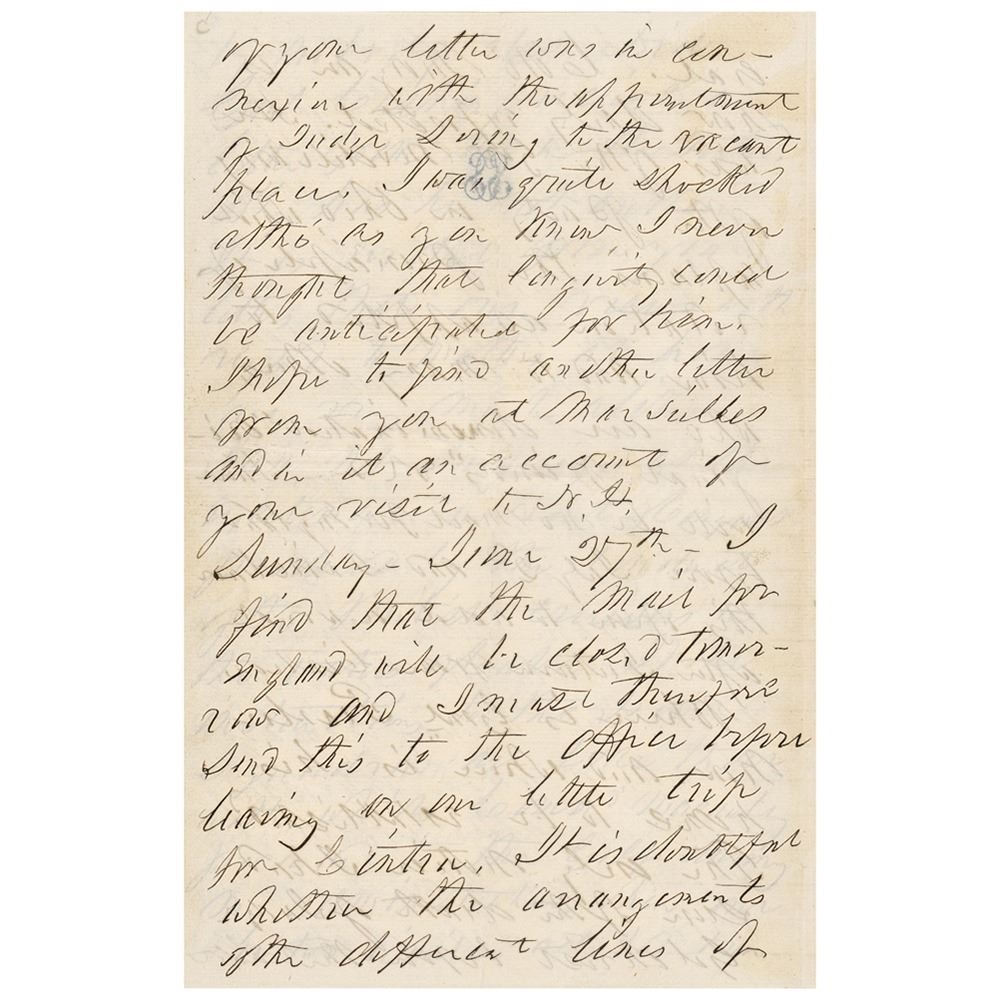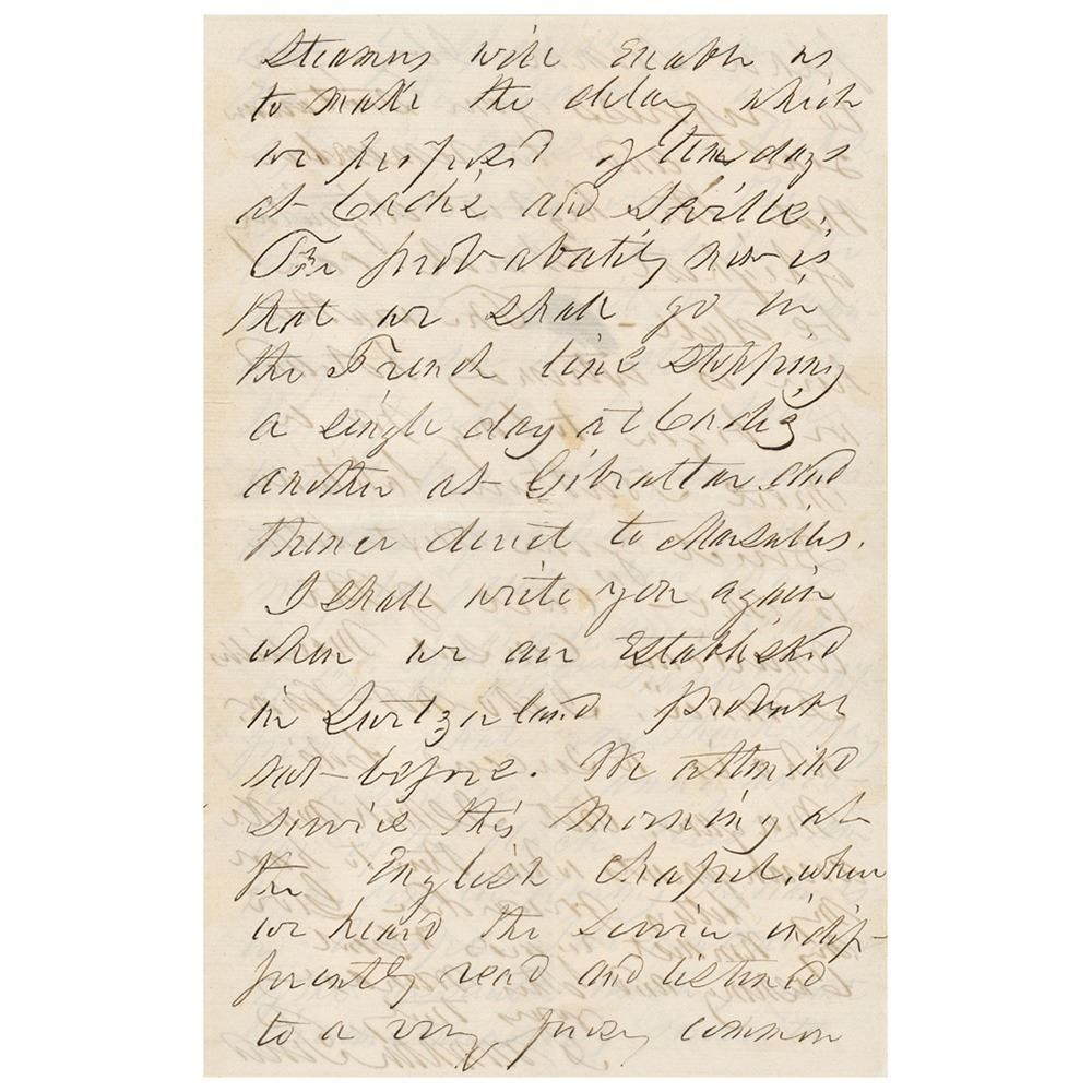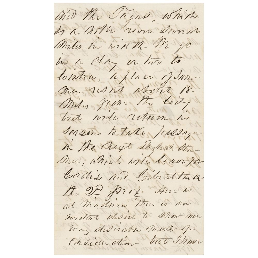 Sunday‚ June 27th—I find that the mail for England will be closed tomorrow and I must therefore send this to the officer before leaving on our little trip for Cintra. It is doubtful whether the arrangements of the different lines of steamers will enable us to make the delay which we proposed of ten days at Cadiz and Seville. The probability now is that we shall go in the French line stopping a single day at Cadiz another at Gibraltar and thence direct to Marseilles. I shall write you again when we are established in Switzerland probably not before. We attended service this morning at the English chapel where we heard the service indifferently and listened to…I beg you to repress your sectarian zeal and to remember that the highest dignitary of [the] highest church can be dull. The weather here is extremely hot and we begin to long for a more northern latitude. Direct your next letter to me 'care of the American consul, Marseilles, France.' I do not know who is to succeed Colo. Morgan, but I shall make arrangements when there to have my letters forwarded. Give my kindest regards to Genl. Cushing and other friends." In fine condition.