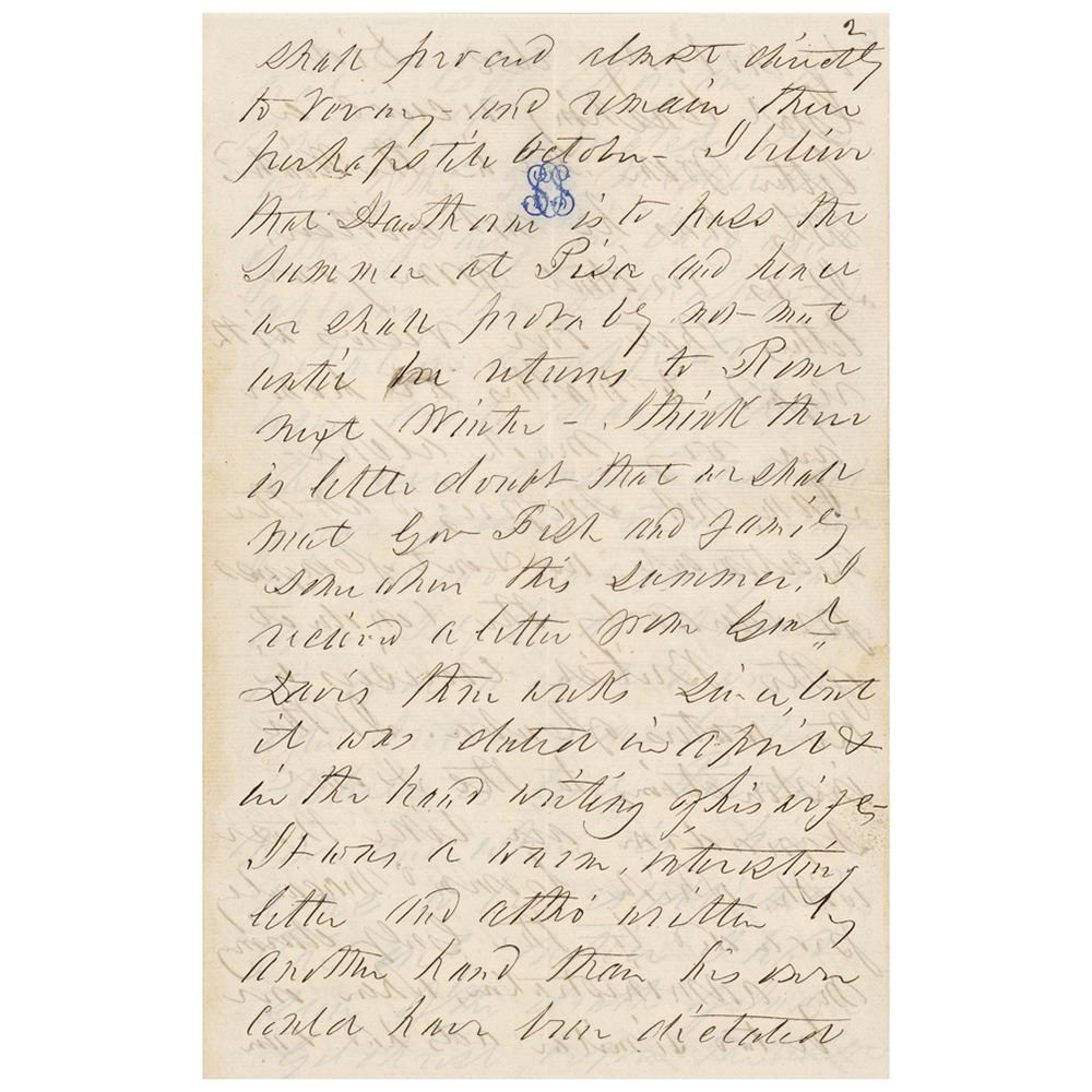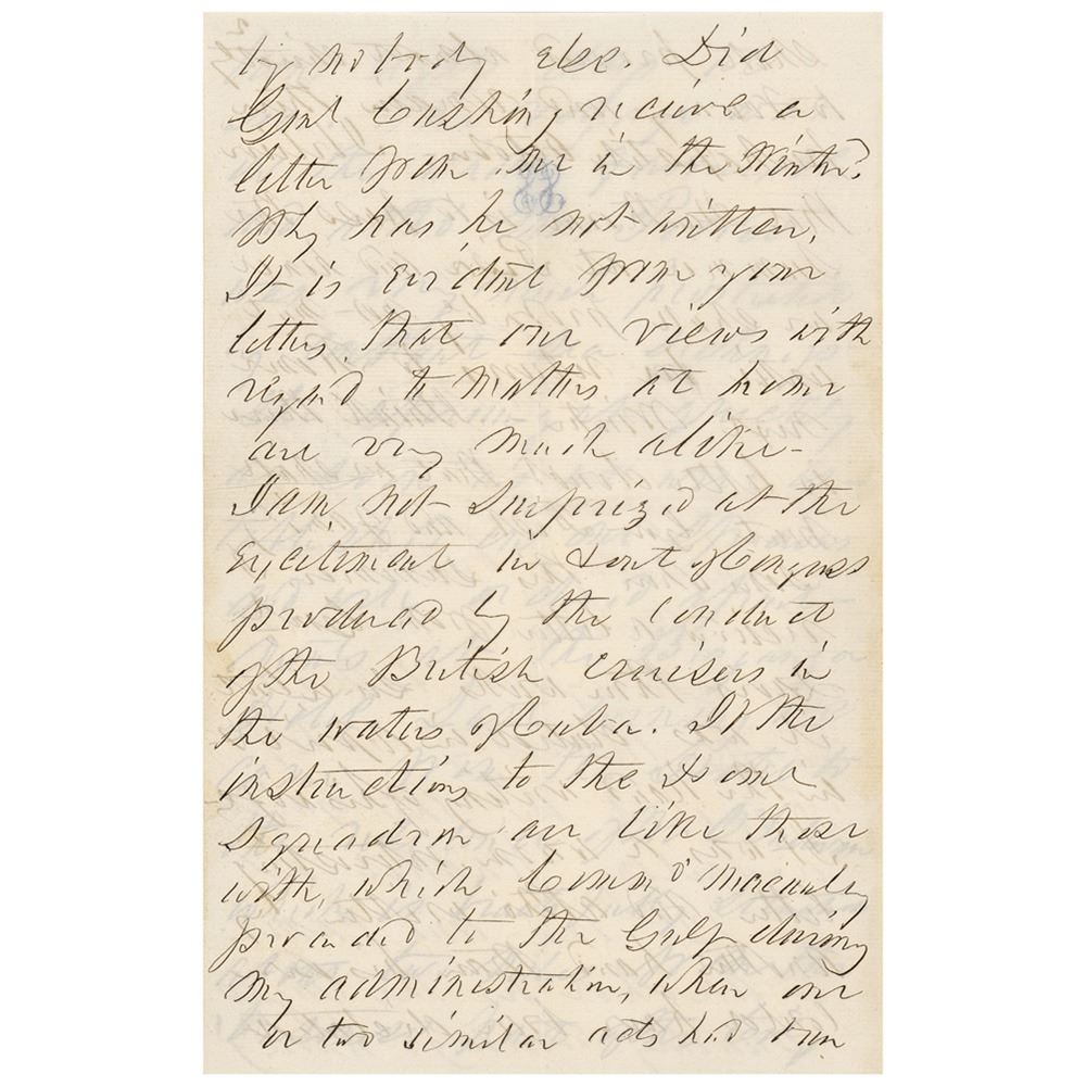 Shortly after leaving the White House in 1857, Pierce returned to his native New Hampshire and then embarked on a three-year tour of Europe and the Bahamas. During his time abroad Pierce maintained correspondence with Webster, the son-in-law of Senator Hamilton Fish and a brilliant Manhattan lawyer who, in 1892, published Franklin Pierce and His Administration. In this remarkable letter, Pierce makes reference to numerous important figures of the day. Among these are naval officer Charles Stewart McCauley, whom Pierce had ordered to protect American interests in Cuba during his administration; his close friend Nathaniel Hawthorne, author of The Scarlet Letter and The House of the Seven Gables, who Pierce had appointed to a diplomatic post in England; future Confederate president Jefferson Davis, who had served as Pierce's Secretary of War; Col. John Hatch George, with whom Pierce had practiced law in New Hampshire; George Bailey Loring, postmaster at Salem who was not reappointed; and John James Gilchrist, whom Pierce had nominated to the Court of Claims.