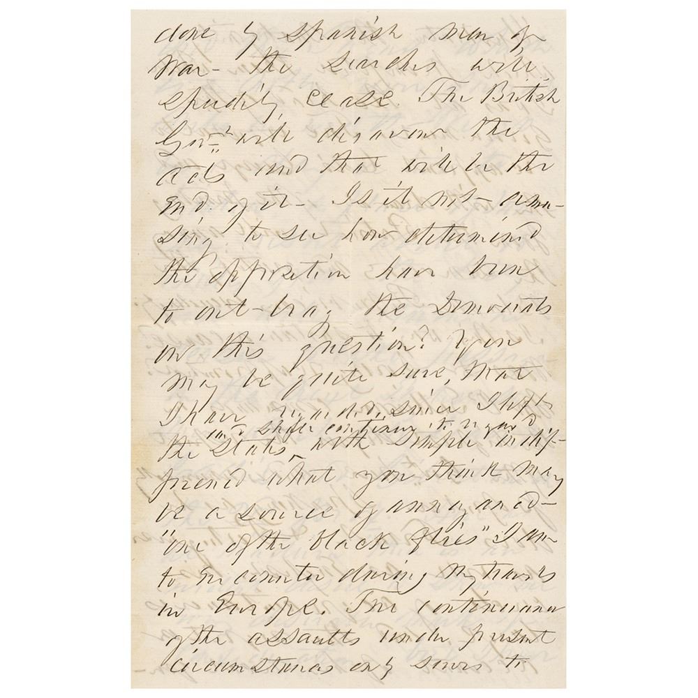 After leaving Gibraltar we shall proceed almost directly to Vevey and remain there perhaps till October. I believe that [Nathaniel] Hawthorne is to pass the summer at Pisa and hence we shall probably not meet until he returns to Rome next winter. I think there is little doubt that we shall meet Gov. Fish and family somewhere this summer. I received a letter from Genl. Davis three weeks since but it was dated in April & in the hand of his wife. It was a warm, interesting letter and altho' written by another hand than his own could have been dictated by nobody else. Did Genl. Cushing receive a letter from me in the winter? Why has he not written. It is evident from your letter that our views with regard to matters at home are very much alike. I am not surprised at the excitement in & out of Congress provided by the conduct of British cruisers in the waters of Cuba. If the instructions to the home squadron are like those with which Commodore MacCauley proceeded to the Gulf during my administration, when one or two similar acts had been done by Spanish men of war, the searches will speedily cease. The British Govt. will disavow the acts and that will be the end of it. Is it not amusing to see how determined the opposition had been to out-brag the Democrats in this? You may be quite sure that I have regarded, since I left the states and I hope to continue to regard with simple indifference what you think may be a source of annoyance 'one of the black flies' I am to encounter during my travels in Europe. The continuance of the assaults under present circumstances only serve to illustrate the malignity which prompted them while I was at the head of government. The refusal to re-appoint Colo. George and the withdrawal of the printing from the Patriot, will annoy Democrats and gratify the Black Republicans exceedingly. Is this way to sustain a cause? Was Dr. Loring reappointed? Mr. O'Sullivan commands in the highest degree the respect of the government here and is universally popular. Speaking as he does French & Portuguese as well as English, his circle of acquaintances is large…
