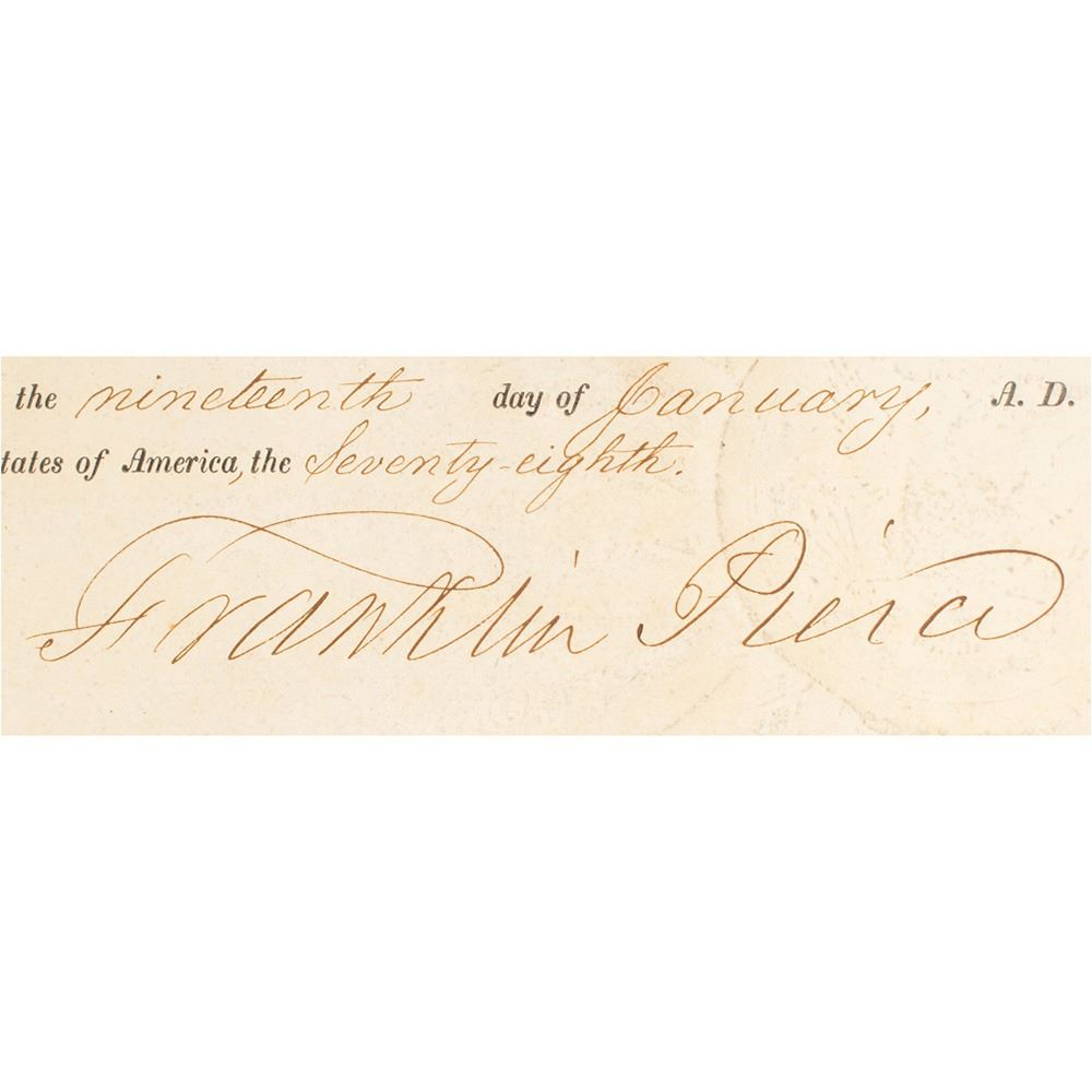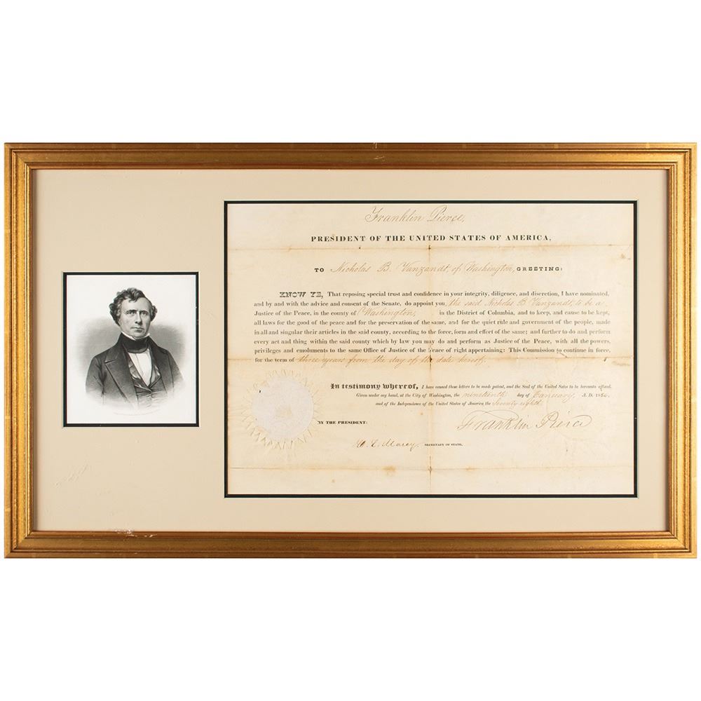 Partly-printed DS as president, one page, 15.75 x 11, January 19, 1854. President Pierce appoints Nicolas B. Vanzandt "to be a Justice of the Peace" in the District of Columbia. Prominently signed at the conclusion in ink by President Pierce, and countersigned by Secretary of State William Marcy. The seal affixed to the lower left remains intact. Nicely double-matted and framed with a portrait to an overall size of 26.5 x 16. In very good to fine condition, with light toning and soiling, some small stains, and small areas of paper loss along the intersecting folds.