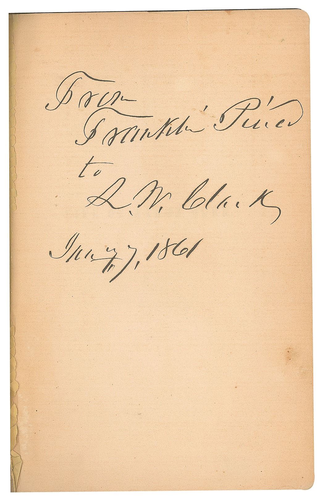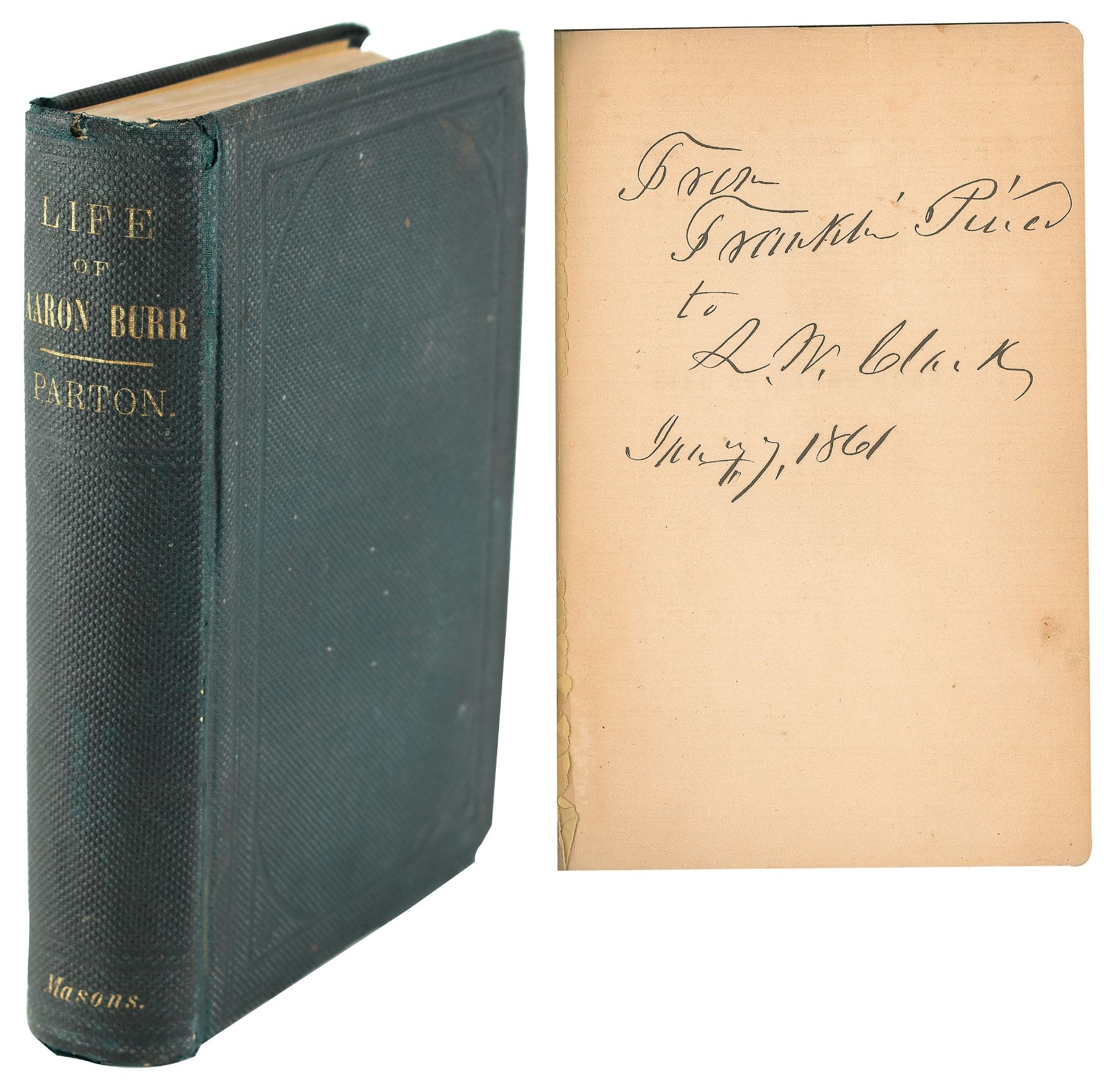Signed book: The Life and Times of Aaron Burr by J. Parton. Thirteenth edition. NY: Mason Brothers, 1860. Hardcover bound in original pebbled blindstamped cloth, 6 x 8, 706 pages. Signed and inscribed on a free end page in ink, "From Franklin Pierce to L. W. Clark, Jan'y 7, 1861." Autographic condition: fine, with a very short tear to the top edge of the signed page. Book condition: VG/None, with bumped corners, wear at spine ends, the first free end page missing, and a "Library of Lawrence E. Miller" blindstamp to a rear page.