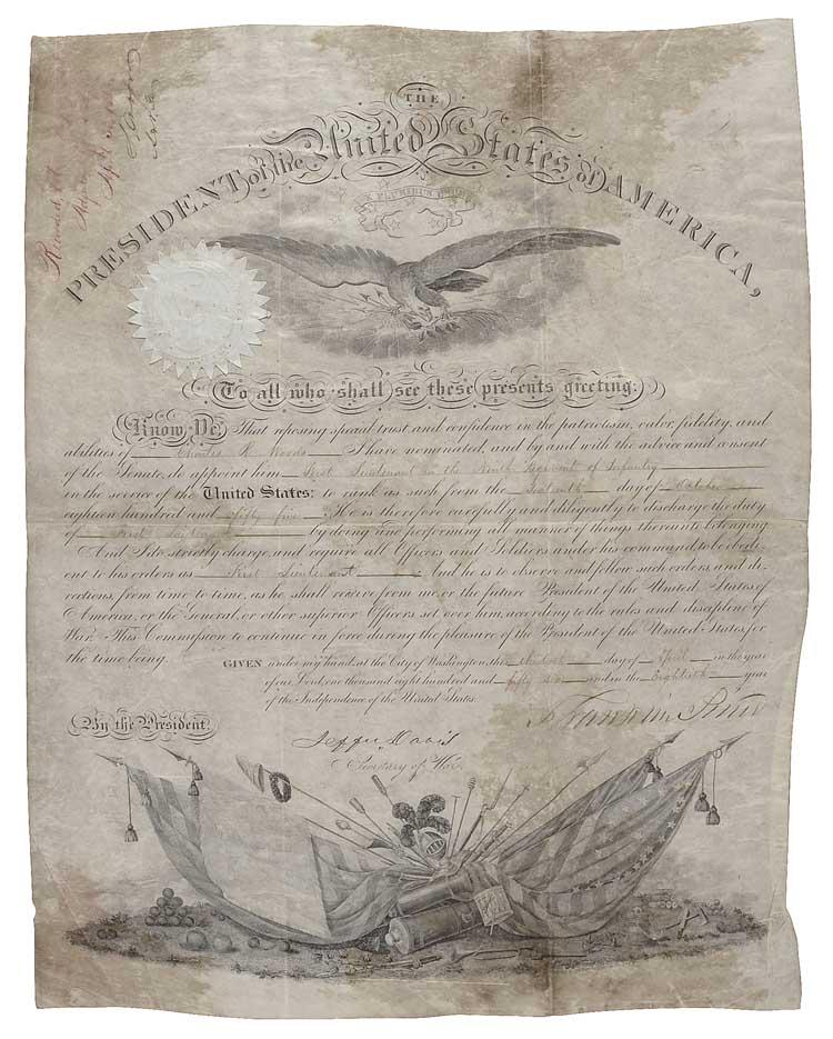 Partly printed DS, signed “Franklin Pierce” as president and “Jeffer. Davis” as secretary of war, one page on vellum trimmed in size to 13.25 x 16.5, April 30, 1856. An appointment for Charles R. Woods as first lieutenant in the Ninth Regiment of Infantry. In good to very good condition, with trimming as noted, intersecting folds, a vertical fold to first letter of Pierce’s signature, wrinkling, and scattered moderate soiling and staining (touching “Franklin”). Pre-certified John Reznikoff/PSA/DNA and RRAuction COA.