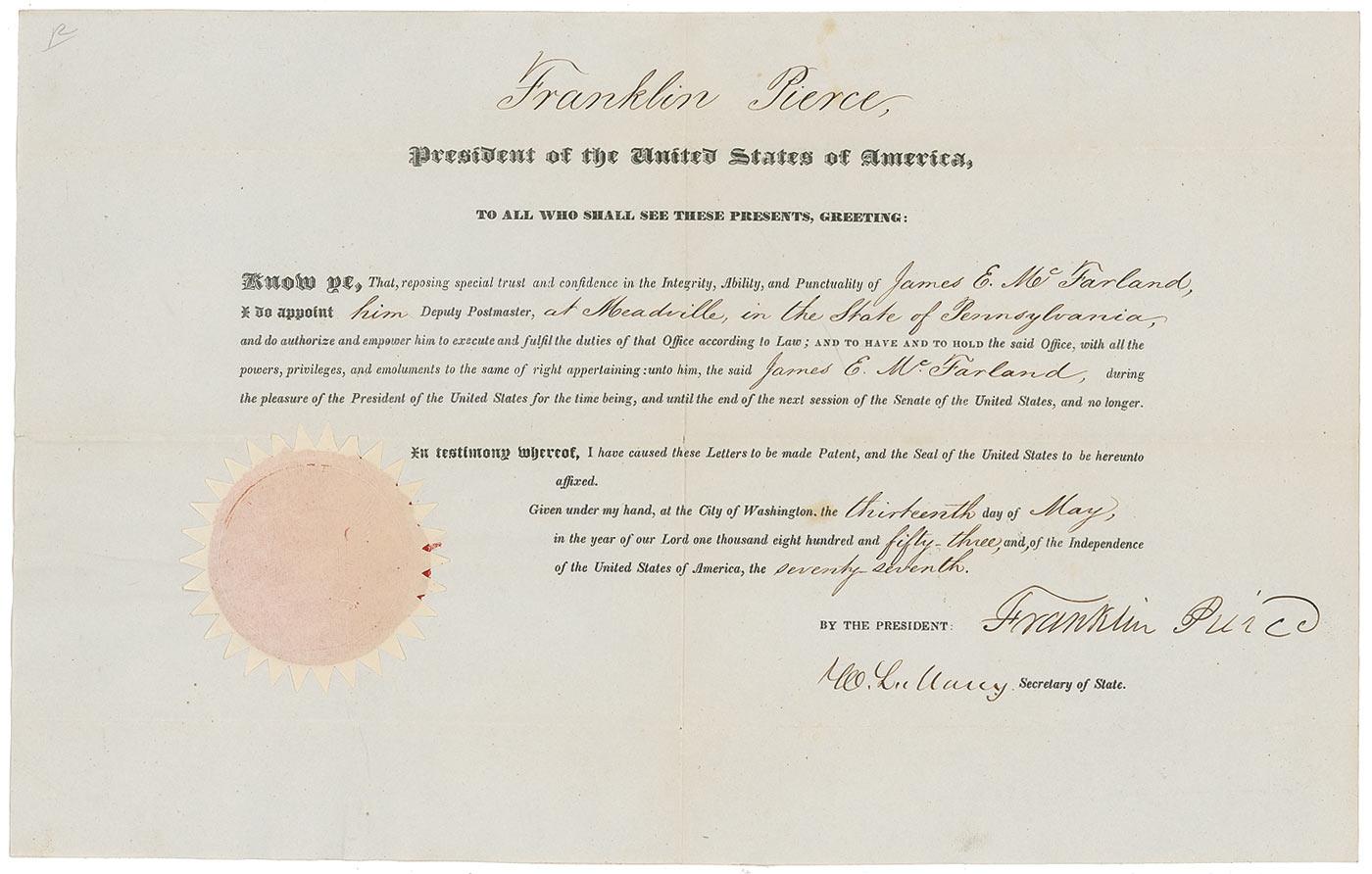 Endorsements of Franklin Pierce as President and Jefferson Davis as Secretary of War, on a panel on the reverse of the second page of a two-page letter from Surgeon General Lawson to Adj. General Samuel Cooper, requesting the dismissal of Assistant Surgeon James R. Conrad for “insubordination” in refusing to report to the Surgeon General’s office in Washington. Davis has written: “Submitted to the President with a recommendation that he Asst. Surgeon Conrad be dropped from the rolls of the Army—Jeffer Davis, Sec of War, June 20, 1853.” Pierce has written: “June 27, 1853, Let Asst. Surgeon J. R. Conrad be dropped from the rolls of the Army with the grounds set forth in the accompanying papers—F. P.” Conrad, who was described as eccentric, was in fact dropped from the rolls the next day. Conrad later served with Abner Doubleday in Fort Johnston. In very good condition, with toning and pinprick-sized holes along folds, several other endorsements and notations to reverse (one lightly affecting Pierce’s initials), and some show-through from text on reverse. Pre-certified John Reznikoff/PSA/DNA and RRAuction COA.