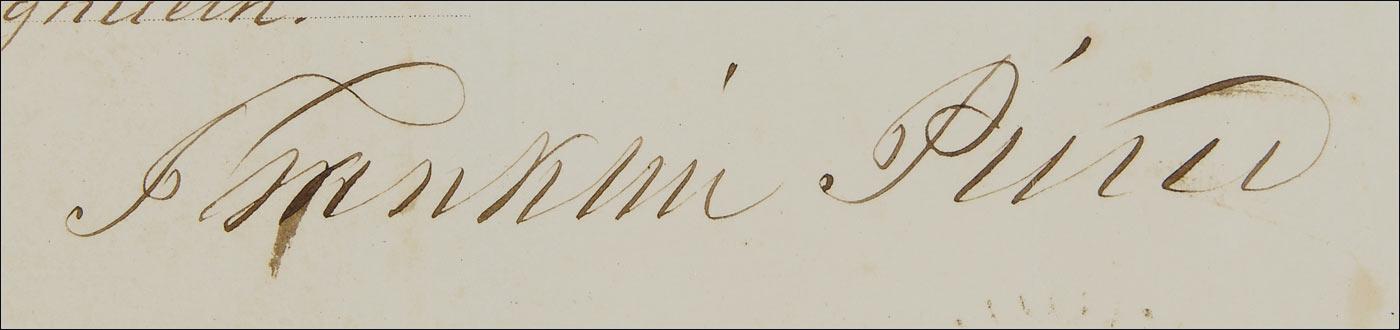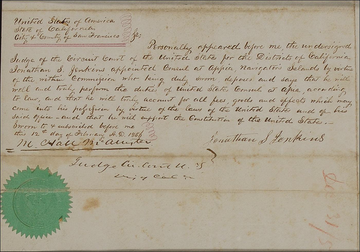 Remarkably clean partly-printed DS as president, signed “Franklin Pierce,” one page, 16.25 x 12.25, December 31, 1855. The president appoints “Jonathan S. Jenkins of California…Consul of the United States of America for the Port of Apia, Navigator’s Islands.” Countersigned by Secretary of State M. L. Marcy. Large Seal of the United States intact. Double-matted with a small portrait to an overall size of 30.5 x 20. Glass on the reverse allows for the reviewing of the document’s opposite side which bears attestation by Jenkins swearing to fulfill his duties. Intersecting folds, two vertical folds passing through his name, brush to his name, scattered mild staining, and areas of separation along a couple of the folds, otherwise fine condition. A highly unusual and fresh copy of a Pierce presidential appointment. Oversized.