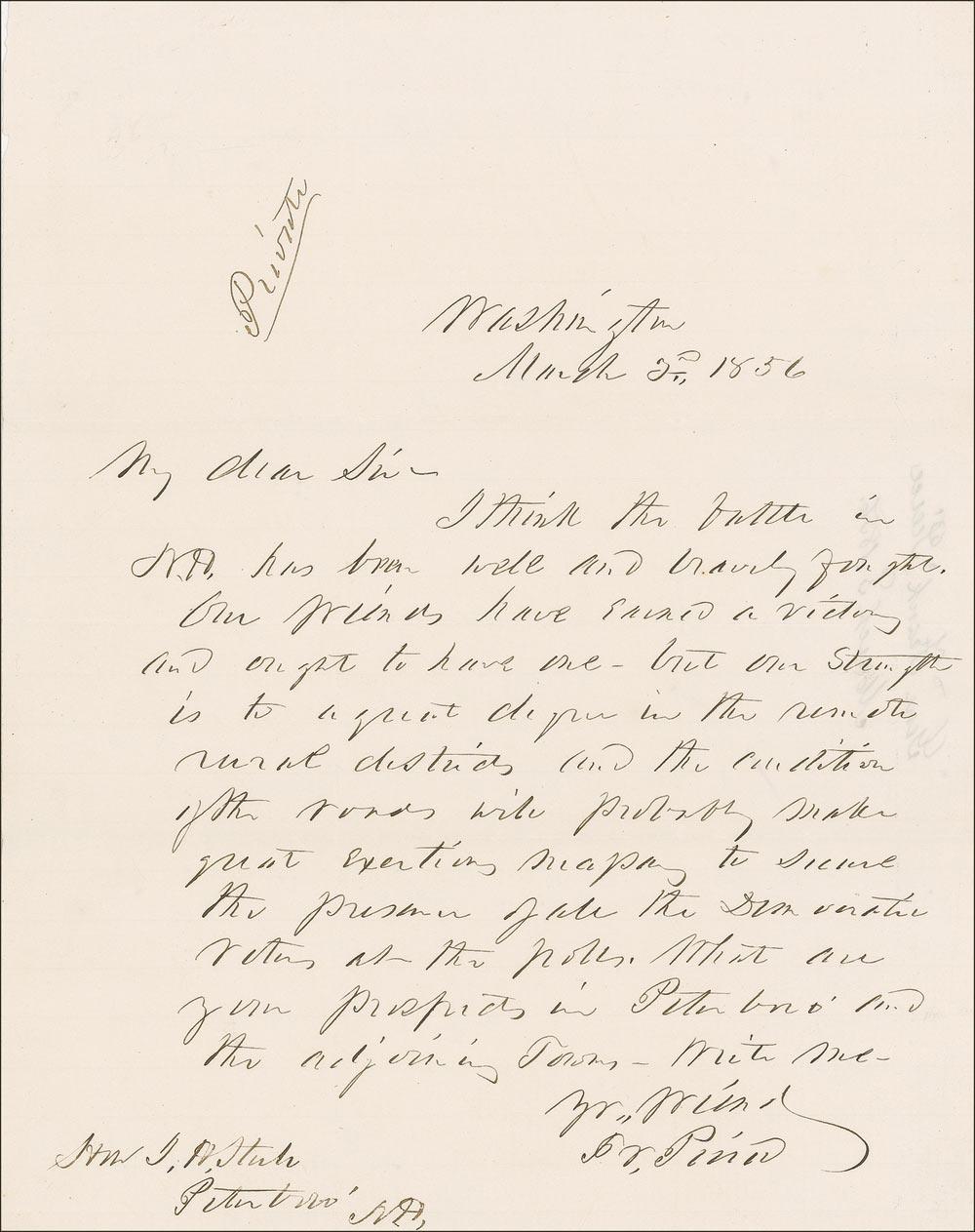 Uncommon ALS, as president, signed “Fr. Pierce,” one page, 7.75 x 9.75, March 3, 1856. Letter to former New Hampshire governor John Steele. In full: “I think the battle in N.H. has been well and bravely fought. Our friends have earned a victory and ought to have one—but our strength is to a great degree in the remote rural districts and the condition of the roads will probably make great exertions necessary to secure the presence of all the Democratic voters at the polls. What are your prospects in Peterboro’ and the adjoining towns—Write me.” In fine condition, with intersecting folds, one through a single letter of signature, and a slightly rough left edge. Letters from Pierce’s presidency are uncommon, with this one showing his dedication to his home state and determination to secure a Democratic victory.