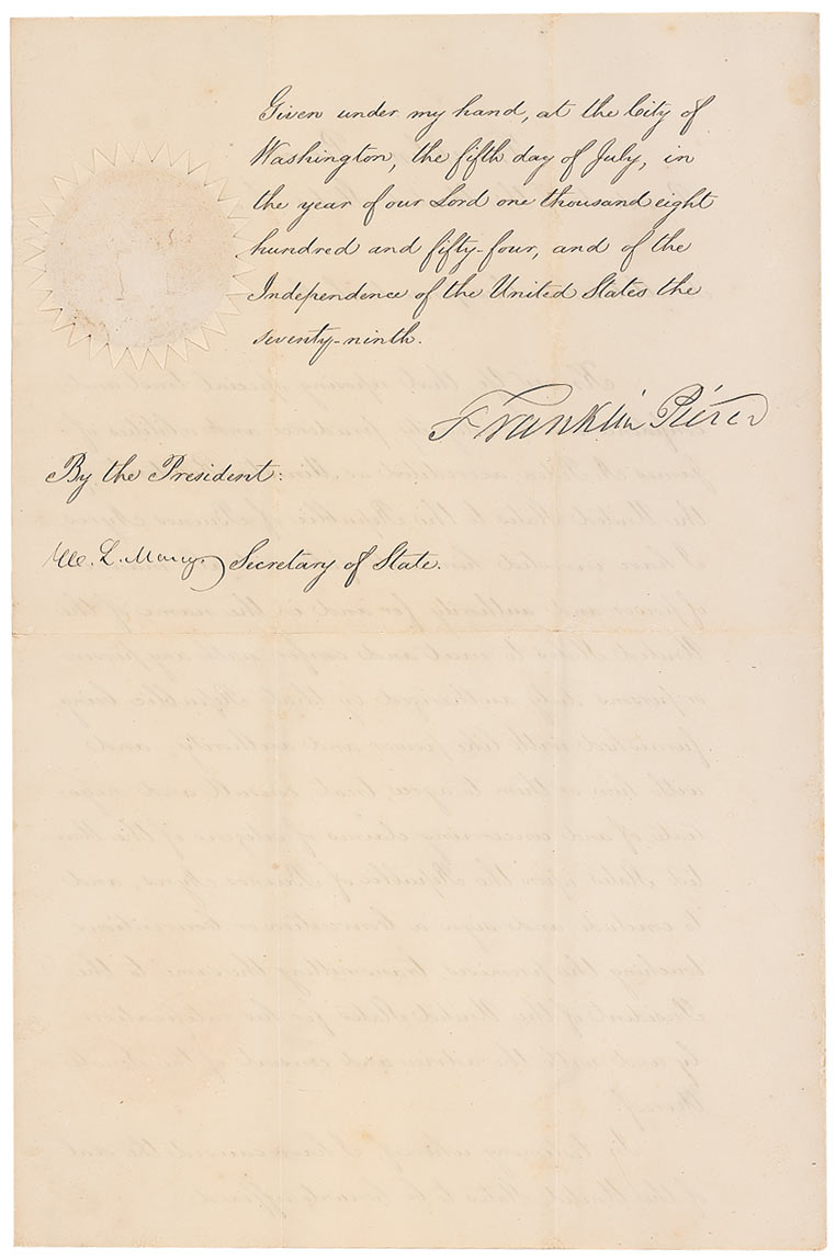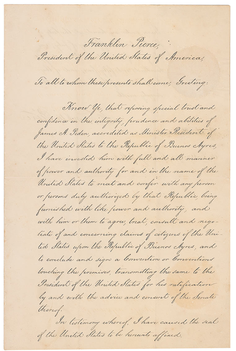 Clear and crisp manuscript DS as president, one page both sides, 11 x 16.75, July 5, 1854. President Pierce appoints “James A. Peden…as the Minister Resident of the United States to the Republic of Buenos Ayres.” Signed at the conclusion by Pierce and countersigned by Secretary of State, William L. Marcy. Intersecting folds, one passing through a single letter of signature, with two tiny points of separation along the central horizontal fold, a uniform shade of toning, light, scattered spots of soiling, and two circular areas of toning from the seal, otherwise fine condition. White seal is crisp and intact.