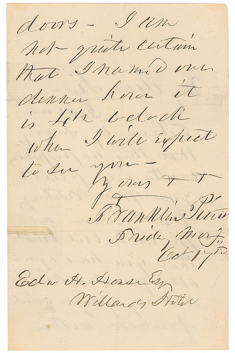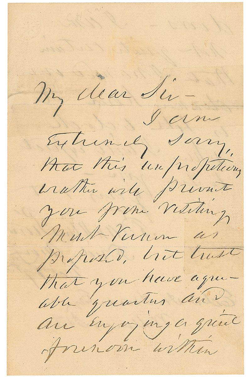 ALS, one page both sides, 4 x 6.25, October 17. Letter to Edward House. In part: “I am extremely sorry that this impropriety…will prevent you from visiting Mont Vernon as proposed but trust that you have agreeable quarters.” In very good condition, with tape repairs to horizontal folds and some scattered light toning.